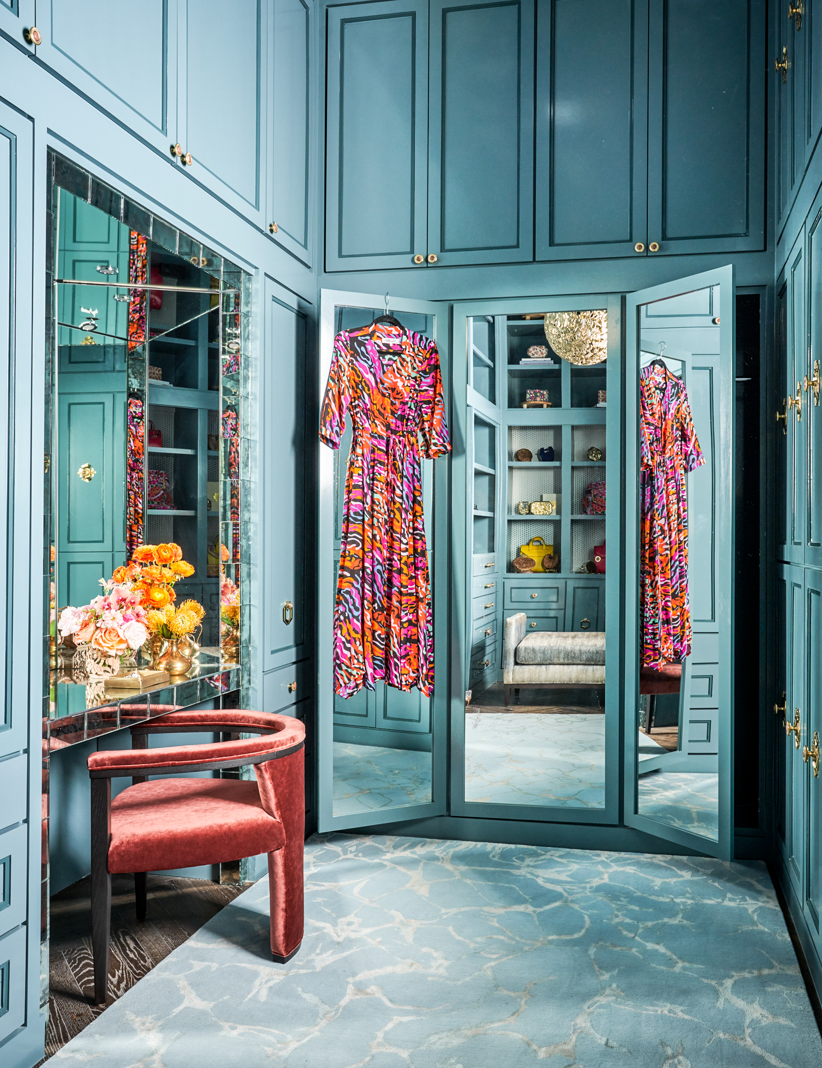 In the dressing room, Bellizaire shifted the palette to one that is moody and sophisticated. With a mural by local artist Connie Harris overhead, Bellizaire chose two complementary Farrow & Ball colors for the cabinets, and she installed a Farrow & Ball wallpaper created by Baton Rouge native fashion designer Christopher John Rogers inside open shelves and on one wall. Artist Mehera Blum of Blumera created a collection of handbags that serve as objets d’art on the shelves. “They really make this space come alive,” Bellizaire says. “When we put the handbags up, everything clicked.”