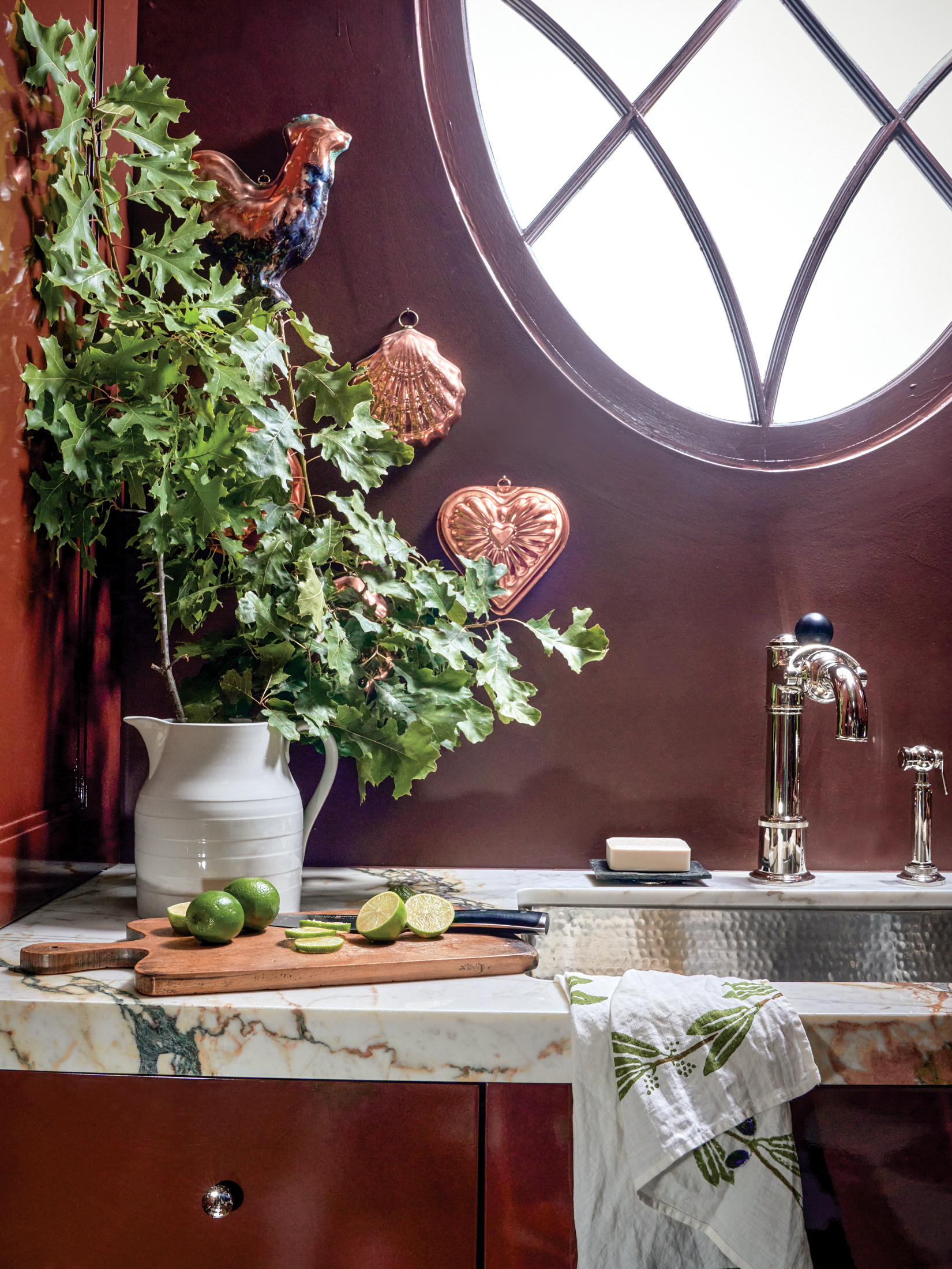 In the adjacent butler’s pantry, Graci painted the walls a deep brown. He surrounded the oval window in this space with copper molds that once hung in his grandmother’s kitchen.