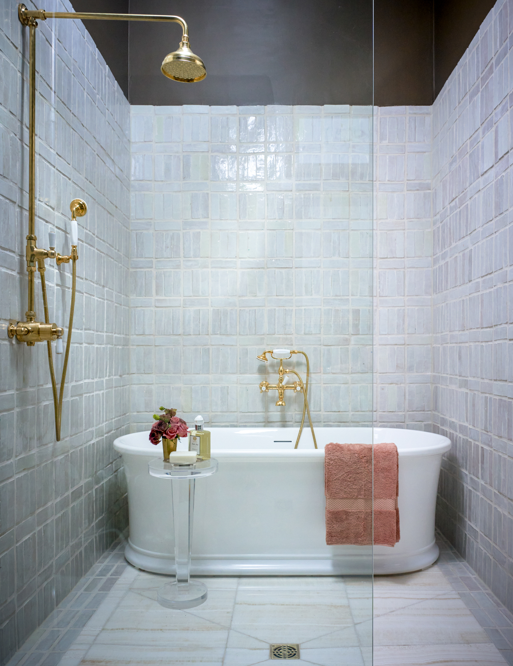 In the adjoining bathroom, Jewel Centanni chose zellige tile to surround the shower and freestanding tub. Elsewhere in the room, Palmer painted surfaces in Farrow & Ball’s “Salon Drab” and hung a gallery wall using paintings and drawings from Ann Connelly Fine Art and Summerhouse.