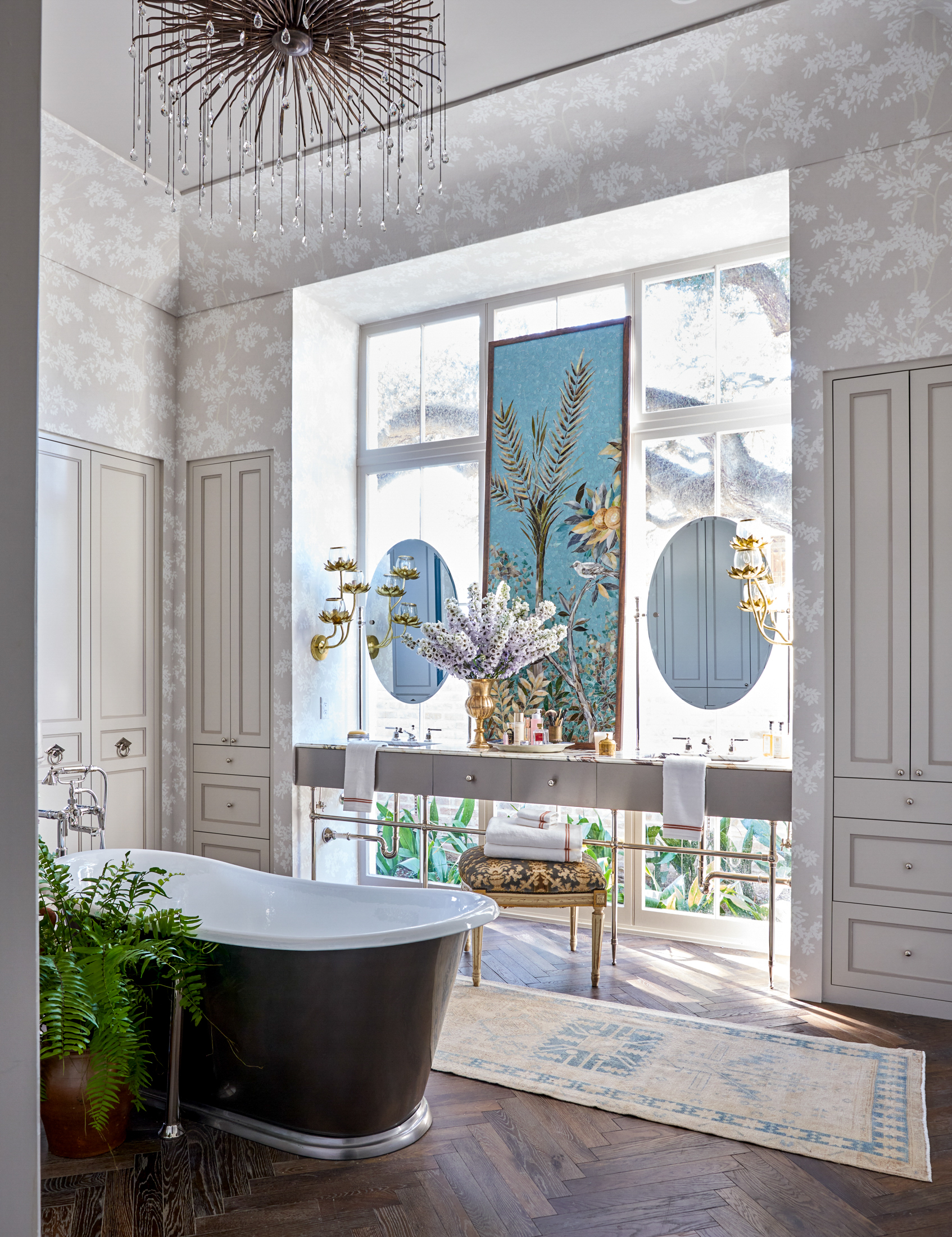 “When I first walked into this space, I was blown away by the size and the amount of natural light,” Bellizaire says of the bathroom. “I wanted to create a canopy of flowers—something that was whimsical, with a little bit of fantasy—but I also wanted it to be relaxing and just feel really good to be in the space.” A framed glass mosaic tile window rests atop the vanity as a piece of art that doubles as a privacy screen against the window beyond. Elsewhere in the room, a bronze sculpture, antique rug and antique bench all came from Fireside Antiques. Fresh blooms throughout these two spaces were designed by AnneMarie Meyers of Hummingbird Floral Studio.