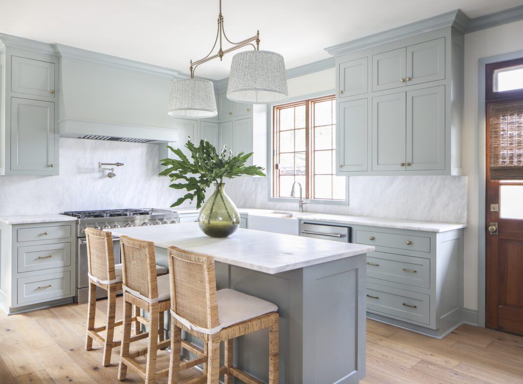 With Sara’s guidance, the mural in the dining room became the inspiration for the color palette throughout the house, its by-the-sea shades translated into paint colors used on cabinets, molding and trim in several rooms. The designer also sourced light fixtures that fit with the home’s style without being too period-specific, and she created “layers of interest” with new textiles and thoughtful placement of furnishings.