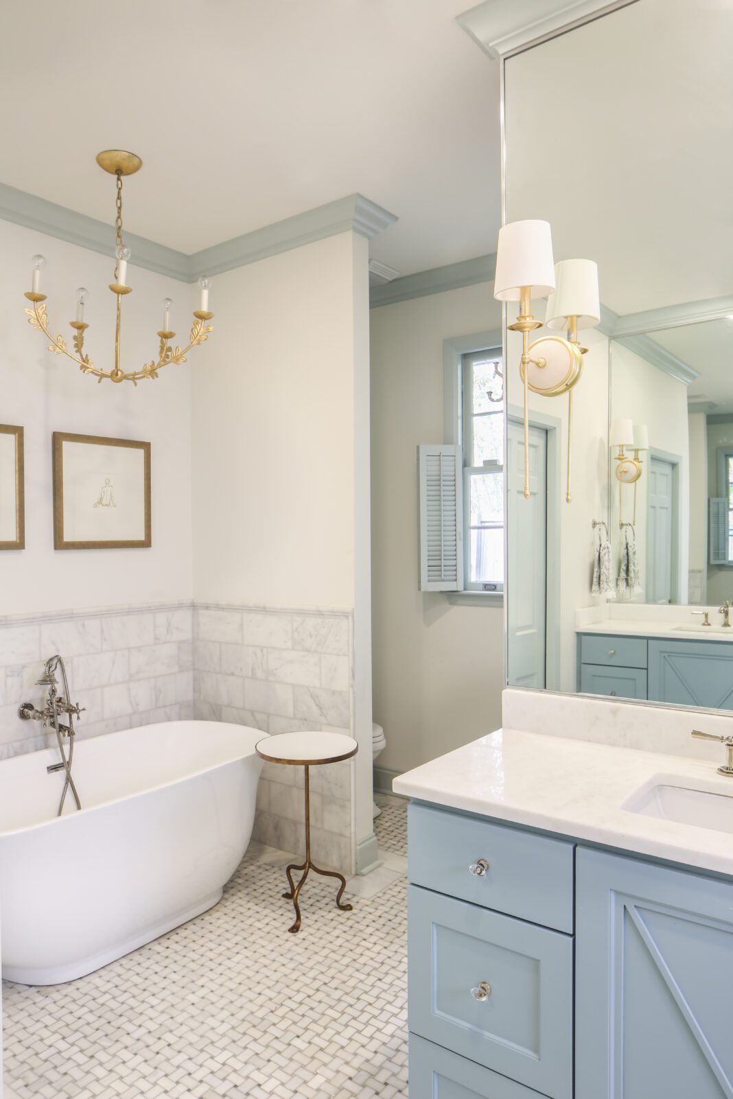 The family affair continued when the LeBlancs contacted architect Rachel Dansky, who is Heather’s cousin, to conceptualize the renovation. Though most of the rooms worked perfectly as is, Rachel offered ways to update the flow and function for modern family life. A former breakfast area, for example, became a laundry room and mudroom. The spacious kitchen retained its original footprint, but with new cabinetry, a new island, and a new bar area nearby. The bathroom in the primary suite was reconfigured to include his-and-hers closets and space for a freestanding tub and separate shower.