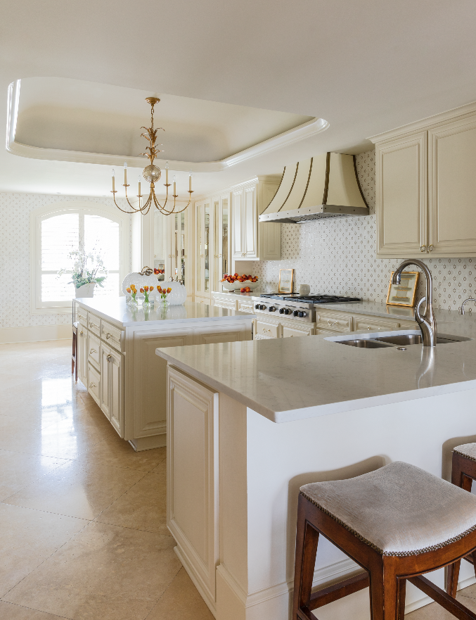 And although the living areas were ample in size, the kitchen felt small and dark. Miller tore out a pantry and a serving bar to reconfigure the area—allowing natural light into the room through an existing window—which increased the size of the kitchen by one-third. Custom marble from Italy serves as the backsplash and extends all the way to the ceiling. New lighting, quartz countertops and hardware complete the refreshed scene. The breakfast area and family room beyond serve as a cozy hangout area for informal gatherings.
