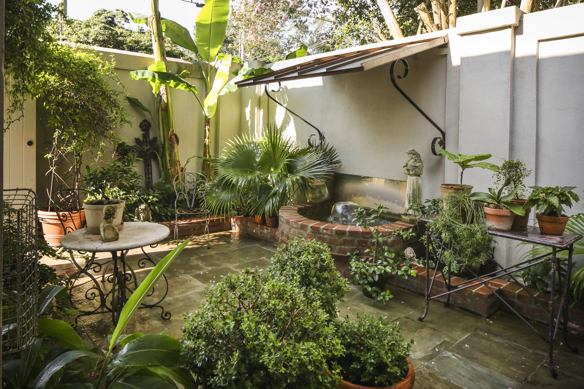 Behind the house, a shady courtyard and a small vegetable garden give way to an alley—“this is where all the neighbors meet up,” Rachel says. An avid gardener, she cultivates and maintains all of the flowers and trees here and in the more formal front garden herself. “When I was a little girl, Daddy used to make us all work in the yard on weekends, and we hated it,” she says. “And now we all love it. It’s a passion.”