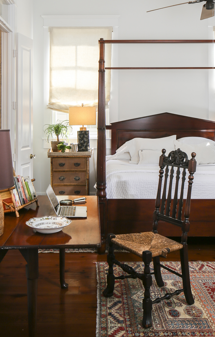 Rachel’s comfortable cottage style is evident in her liberal use of white cotton slipcovers and warm antiques—mostly English but with a little French mixed in. “English pieces are very straight and serious, but the French ones are joyful and happy,” she says.