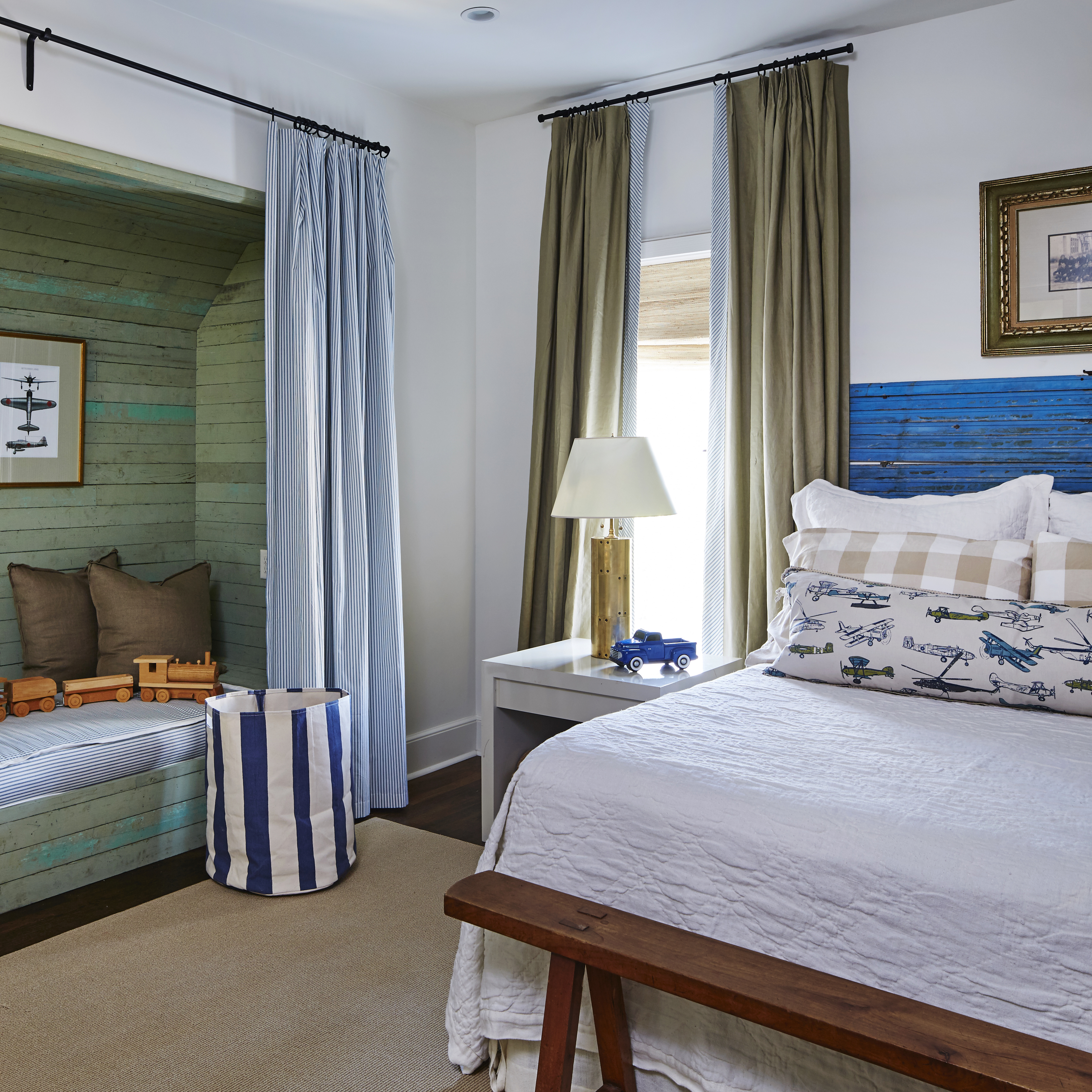 A nook lined with salvaged wood provides a hideaway for Rett Gilbreath, son of designer Ashley Gilbreath. Photo by Laurey Glen.