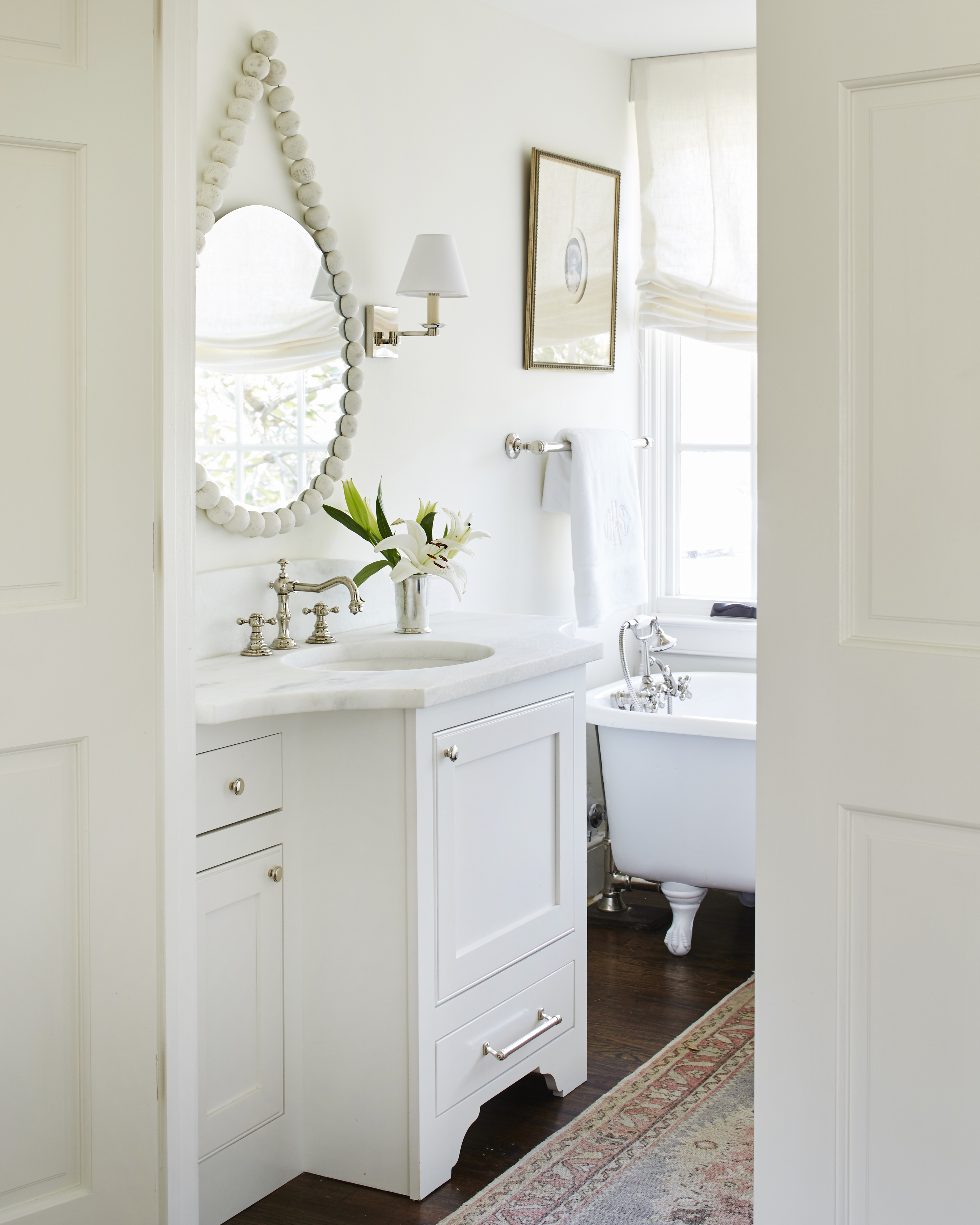 This kids’ bathroom designed by Ashley Gilbreath provides a touch of whimsy with a bead-outlined mirror. Photo by Laurey Glen.