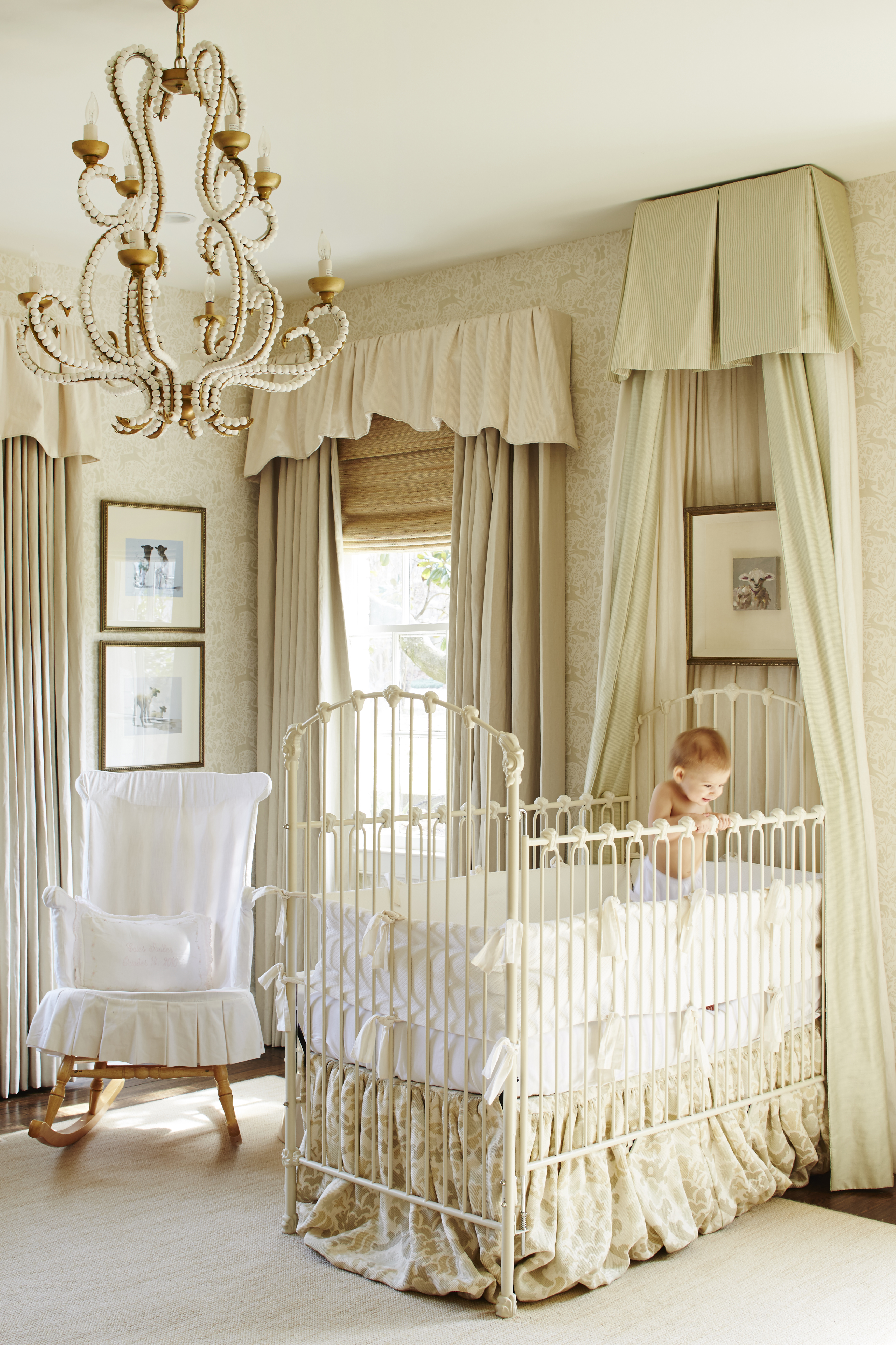 This nursery, designed by Ashley Gilbreath for her youngest daughter, brings softness with valance-topped draperies and muted colors. Photo by Laurey Glen.