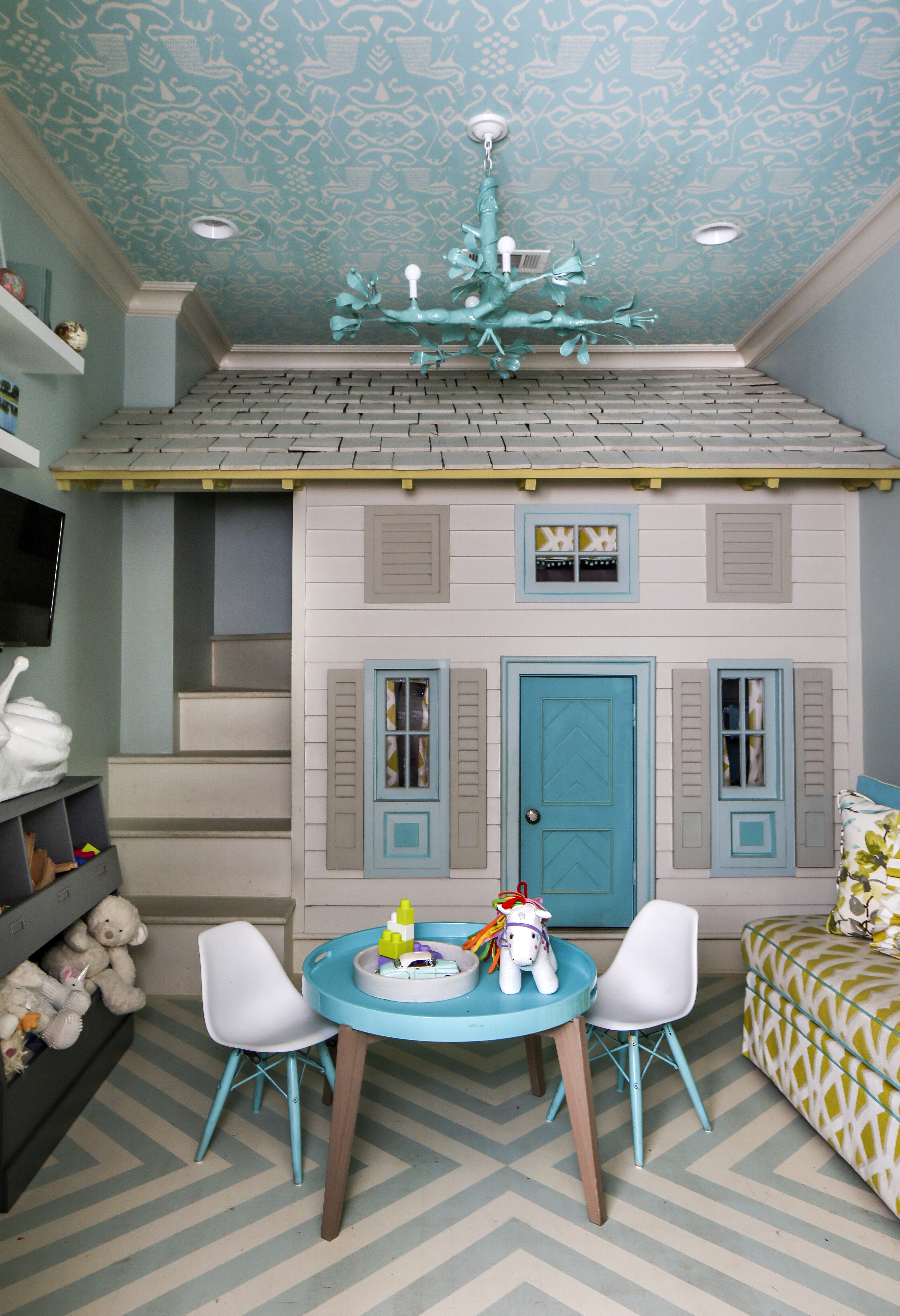 The Hill children’s playroom features bold turquoise wallpaper and a two-story playhouse built into the back wall. Photo by Melissa Oivanki.