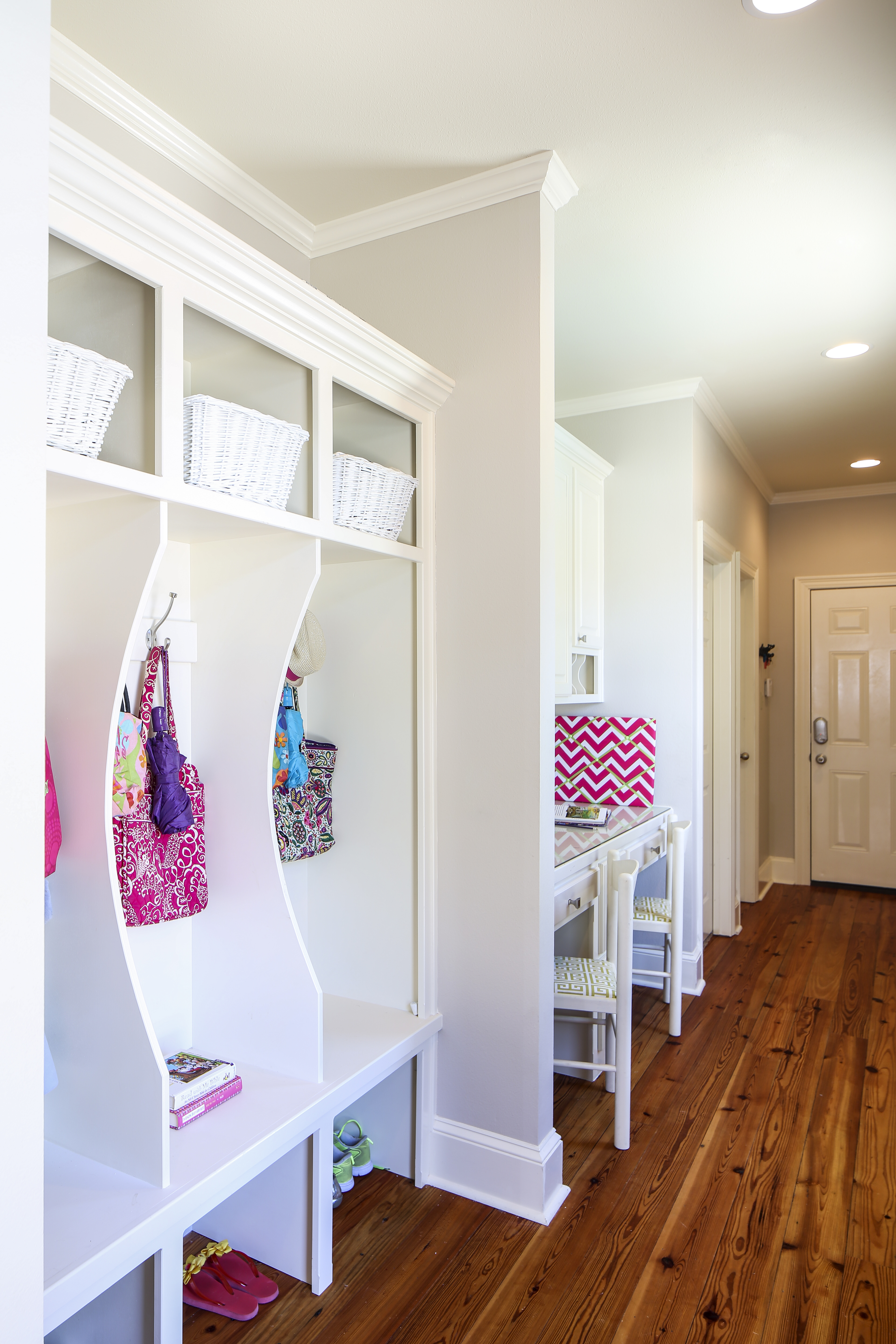 Paul Cancienne created a locker-style mudroom for the Foco family to store backpacks, shoes and more. Photo by Melissa Oivanki.