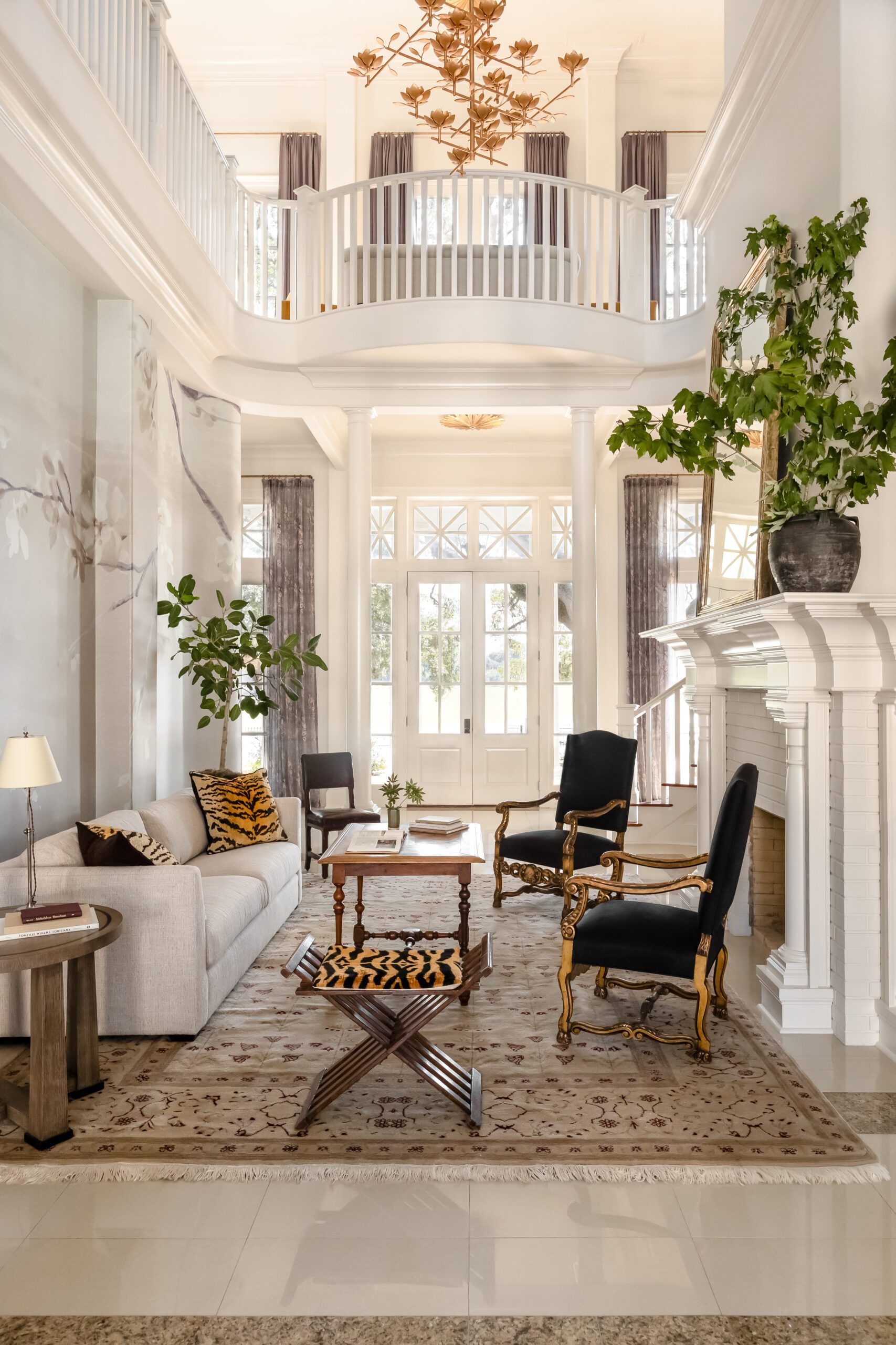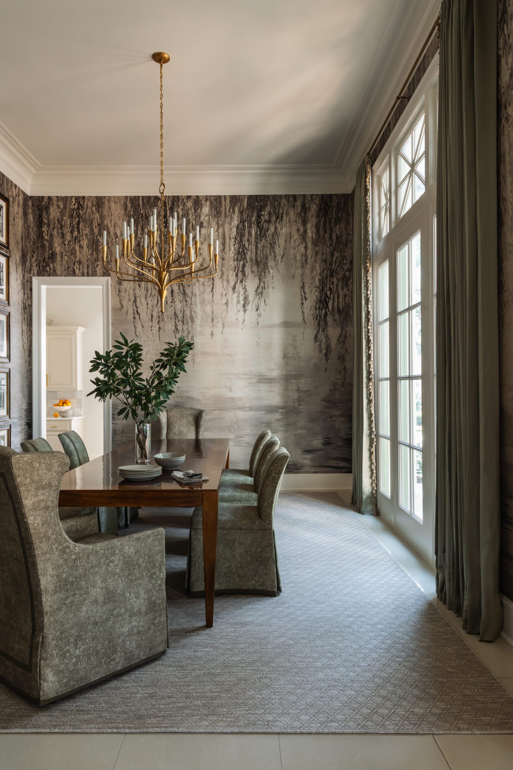 The abundant trees on and related to LSU’s campus inspired the design of the adjacent dining area, which features a showstopping gallery wall of black-and-white photographs of sturdy oaks and swaying cypresses. The photos were taken by local attorney and LSU alumnus Randy Roussel, who has published several books of his south Louisiana nature photography. Nods to the local landscape permeate this space, from the wallpaper to the upholstered chairs to the draperies trimmed with moss-like baubles.