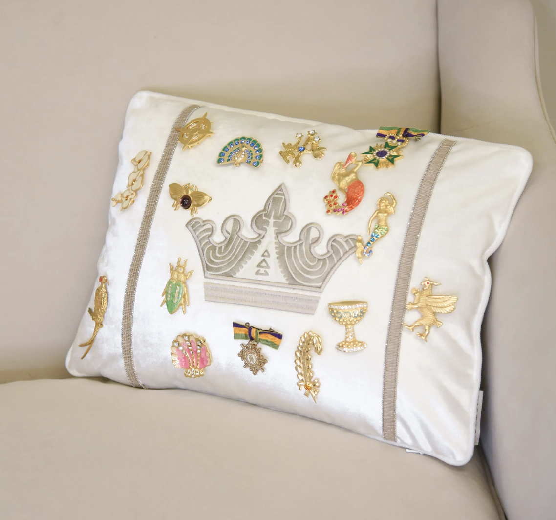 The pillows cost $335 each and come in two varieties: an Antique Gold appliquéd crown with Antique Gold trim, or the Gold appliquéd crown with Gold trim.