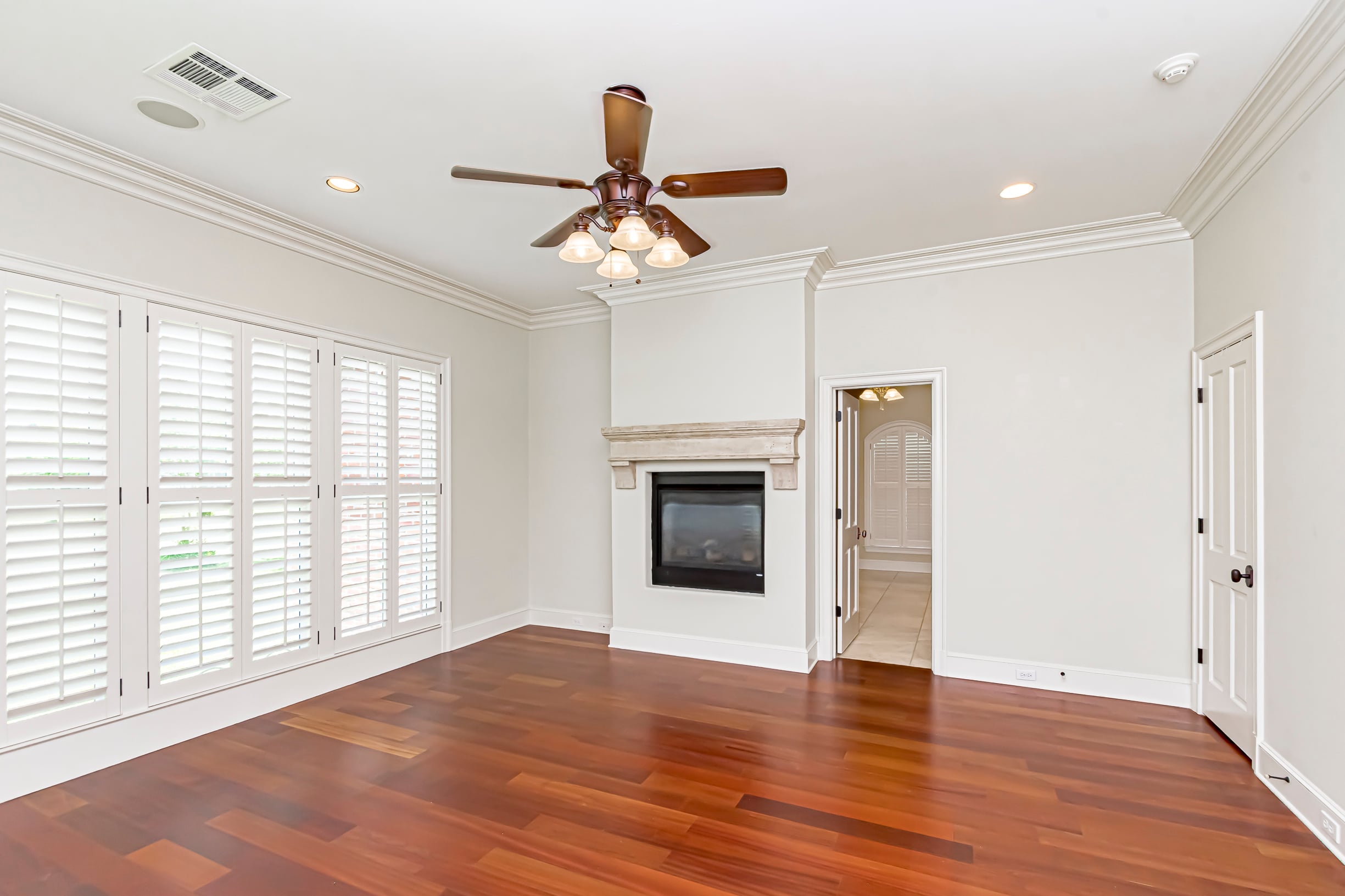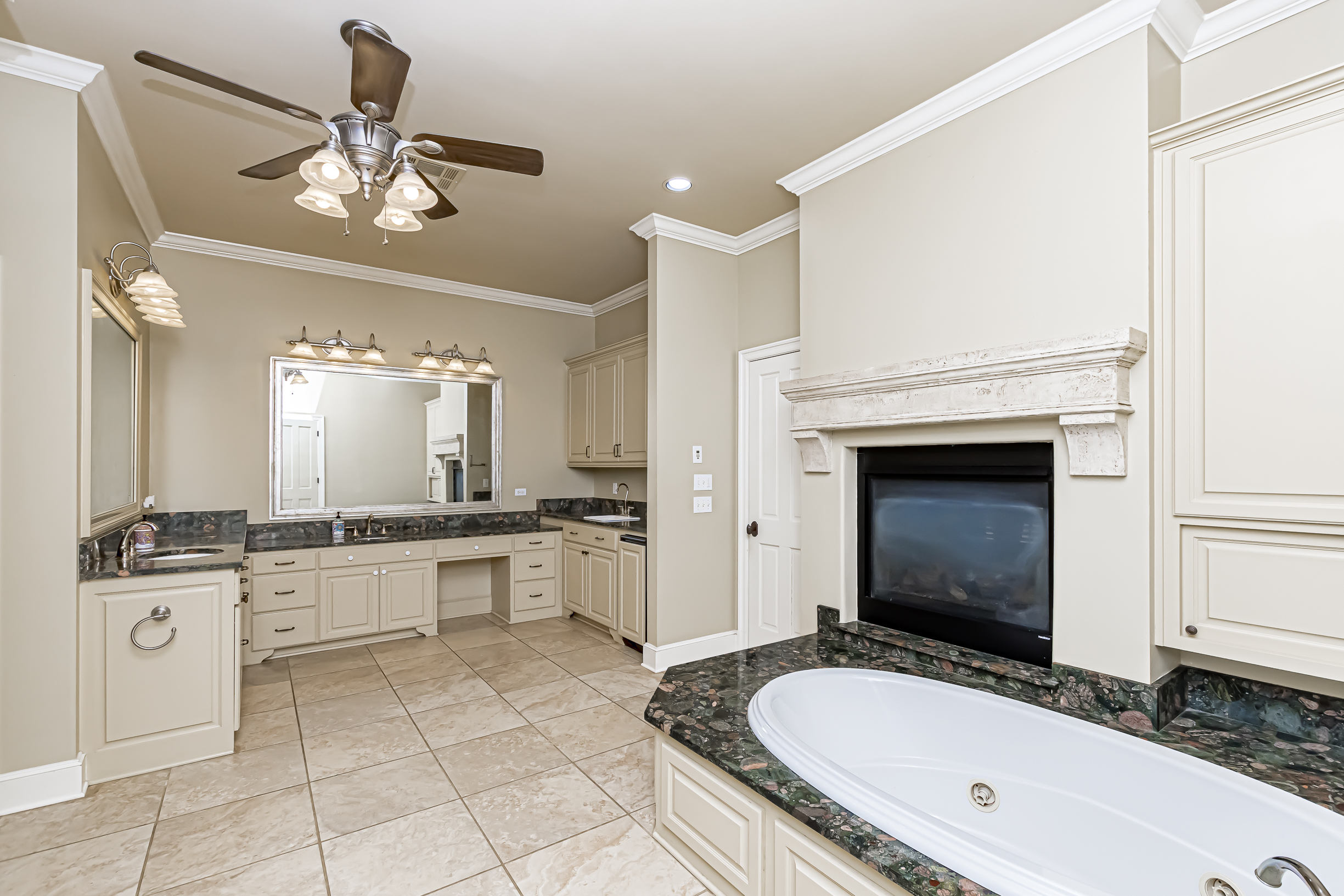 The master ensuite features double vanities, fireplace, jetted tub, separate shower, dressing vanity, ceiling fan, lots of cabinets, a large walk-in closet and office nearby. The room and office can be closed off, with glass double doors to give privacy. Upstairs are four bedrooms and two bathrooms. Three 50-gallon gas hot water heaters ensure a steady supply.