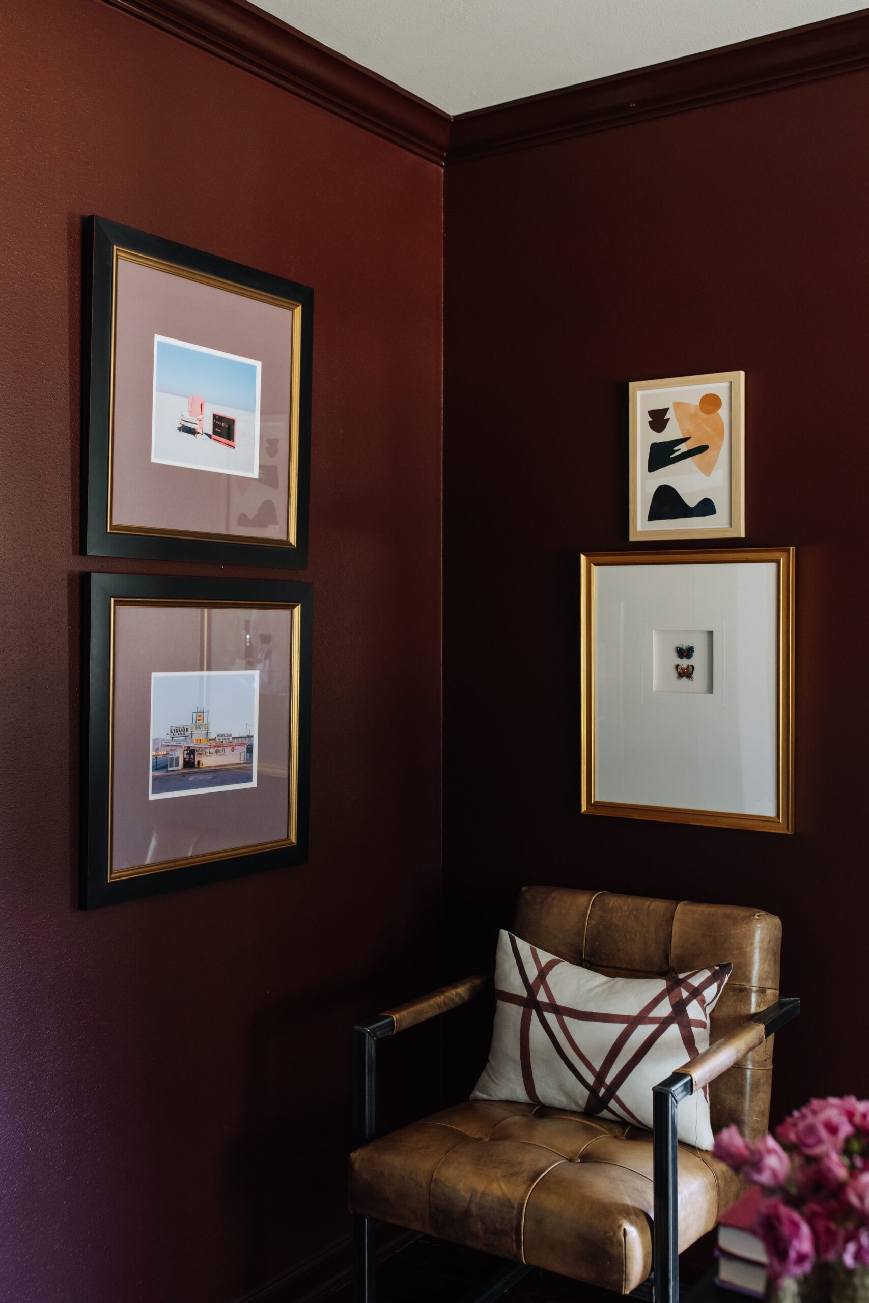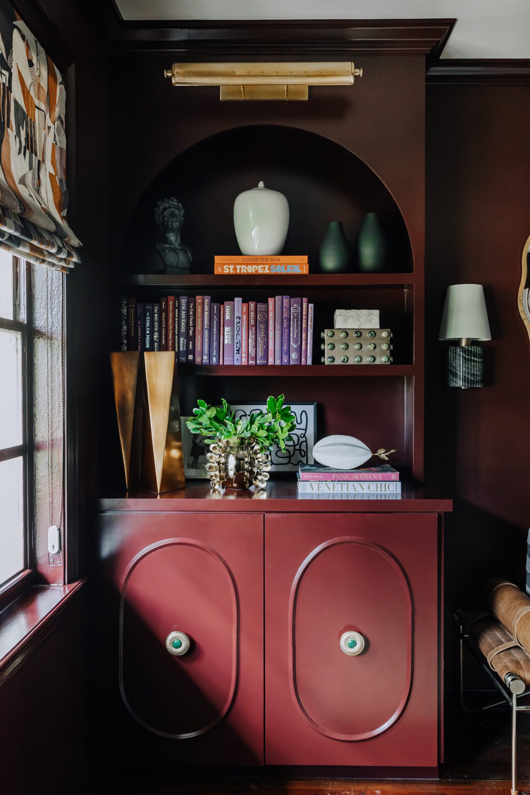 The moody maroon hue helped transform this space from a kids’ playroom to a creative space to both work and recharge.