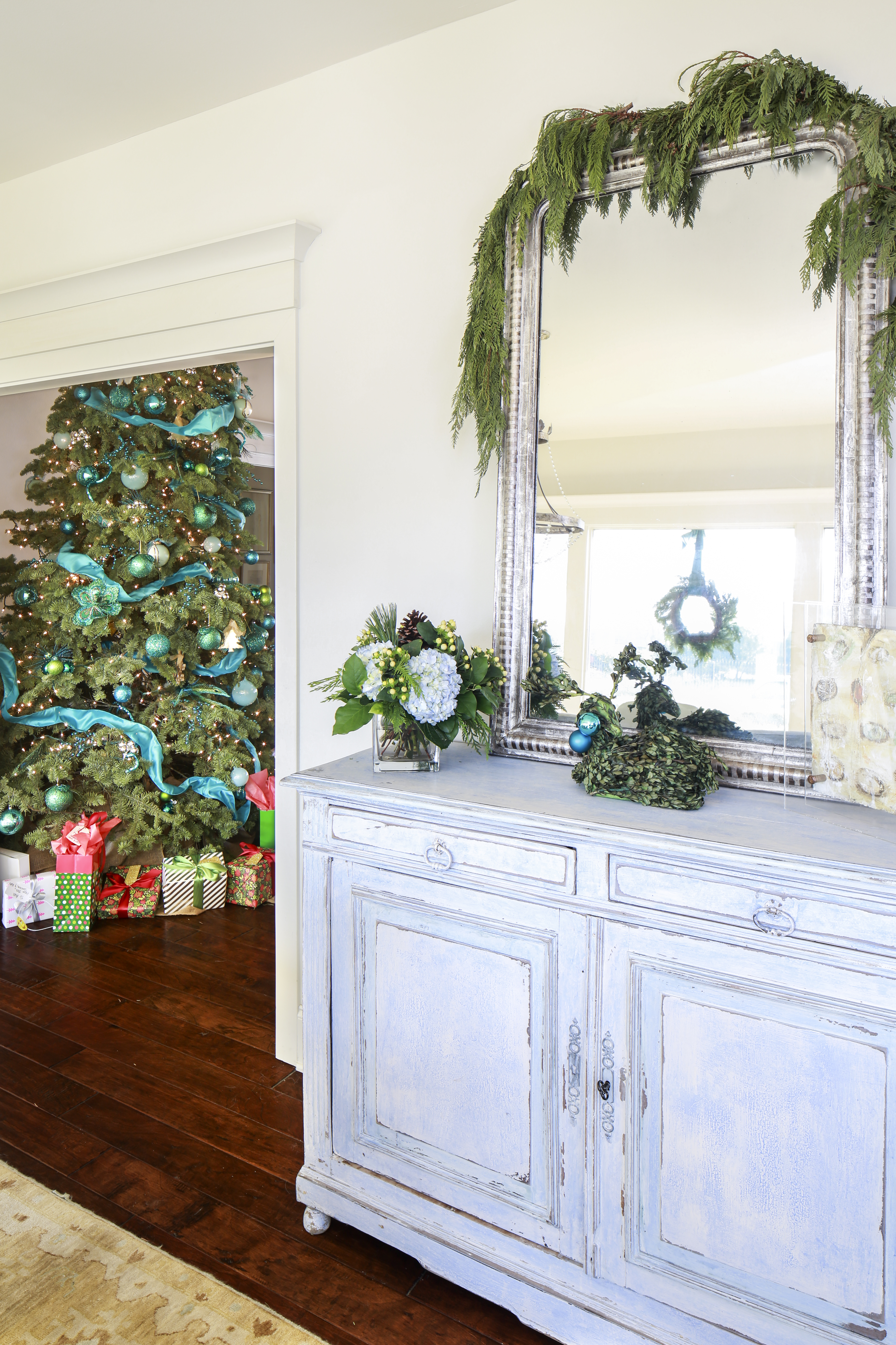 Vibrant turquoise and aqua blue ornaments, many handpainted by local artists, fill the tall tree in the living room. Designer Shane Griffin pulled the scene together with swirls of shimmering ribbon and coordinating finishing touches.