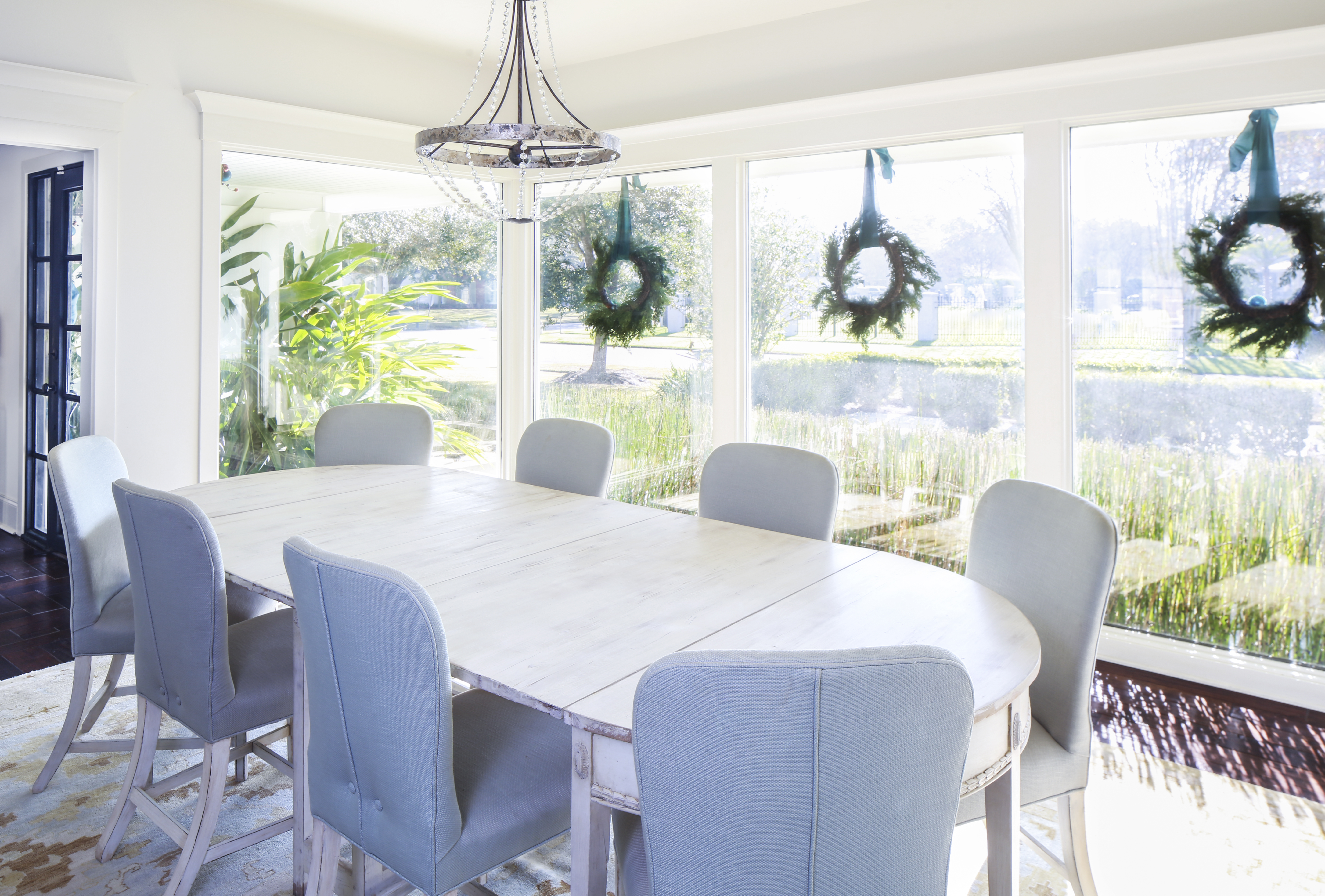 The vivid color scheme was carried throughout the vaulted-ceiling living room. Griffin tucked a grouping of ornaments in the large glass vessel containing an orchid on the coffee table, and he paired the main turquoise shade with apple green in a low-slung garland and ornament vignette on the mantel. In the adjacent dining room, he topped a whitewashed buffet with a simple floral arrangement and a reindeer decked in seasonal boxwood, but he kept the oval dining table clear to allow for unobstructed views of three wreaths hanging on the outside of this room’s large windows.