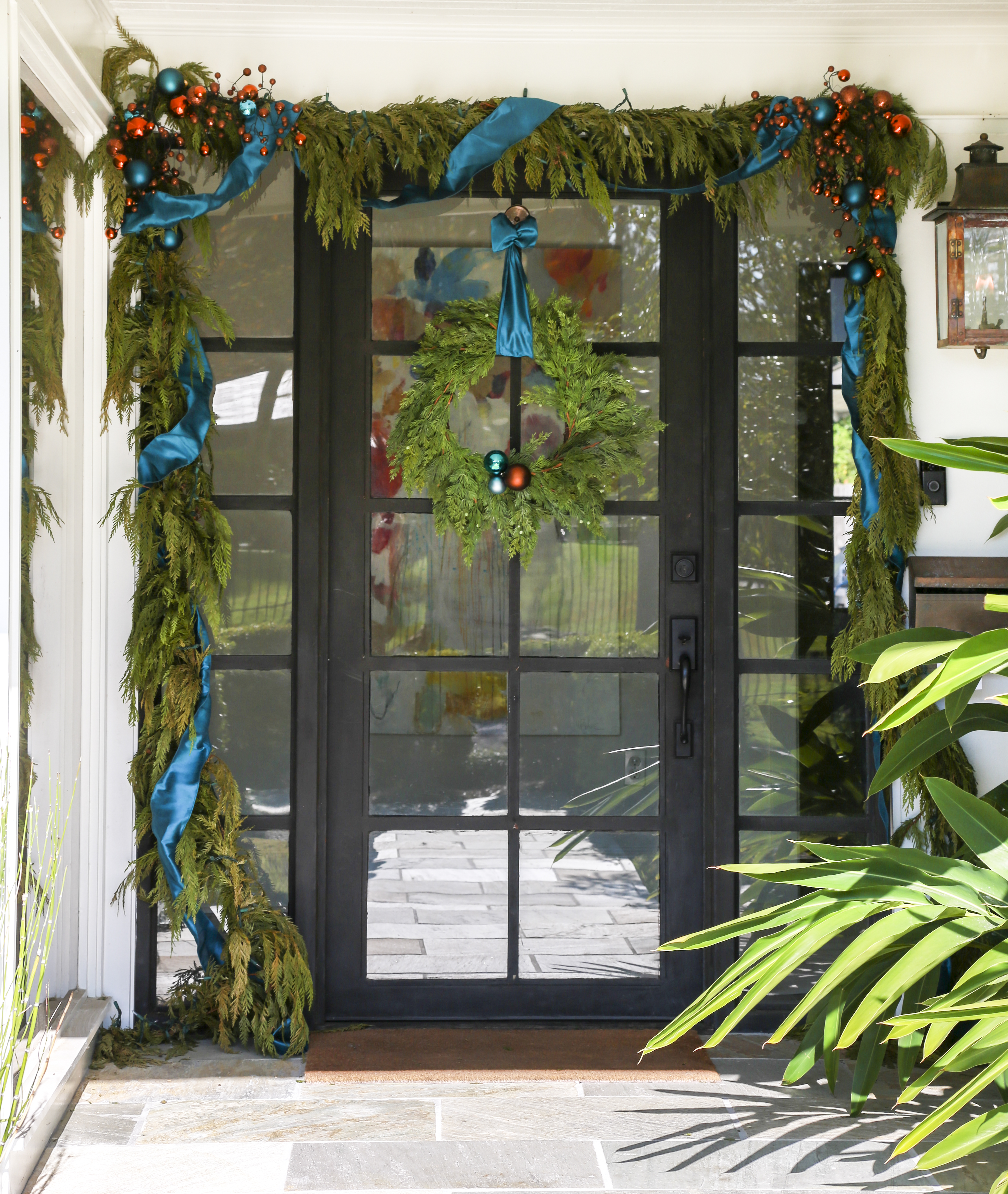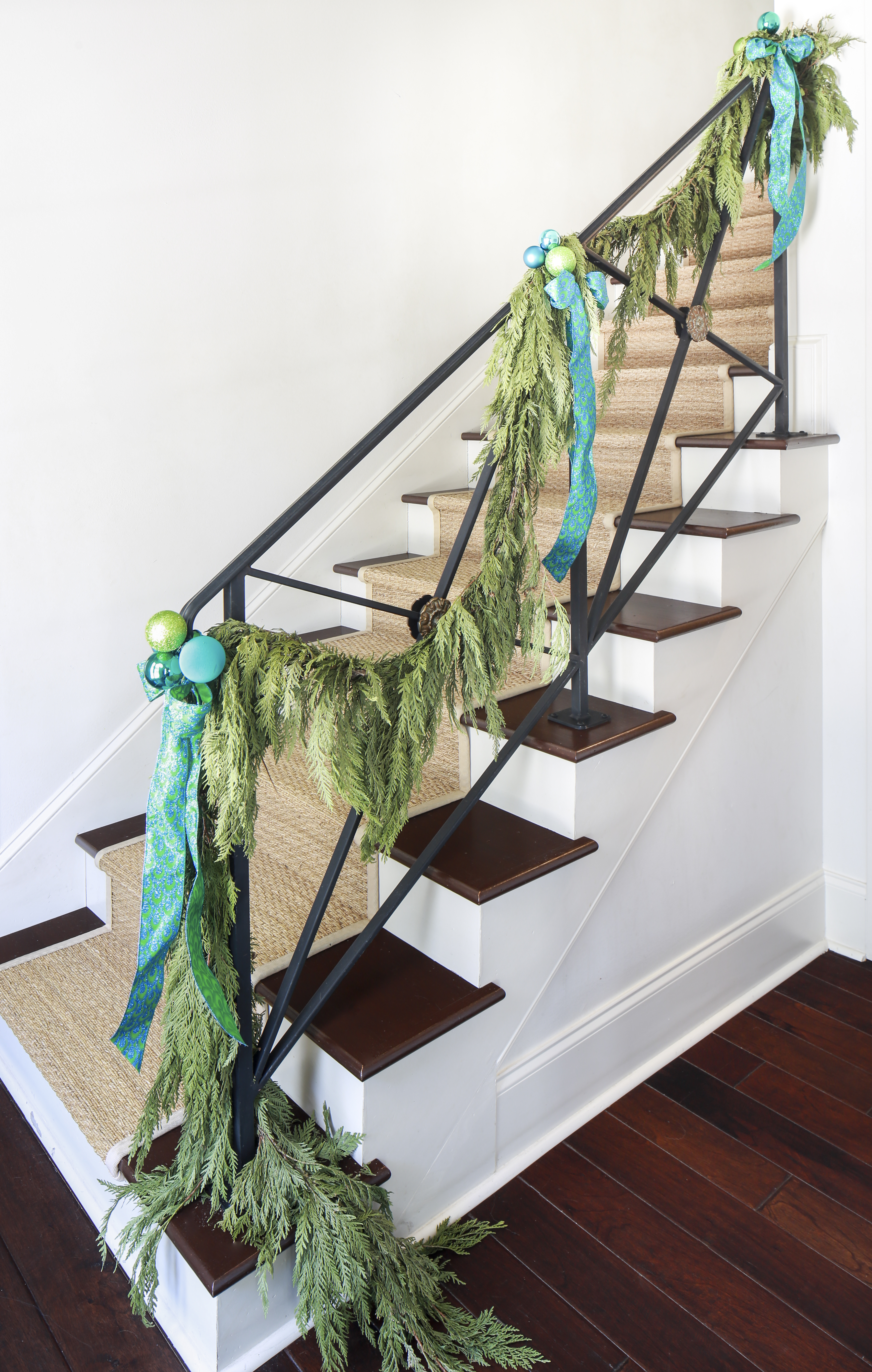 “I like to keep things simple and tasteful,” Griffin says. “My favorite spot is probably the garland on the stair railing, how it drapes along the iron with the satin ribbons. The turquoise and apple green contrasting with the black iron—love it.”