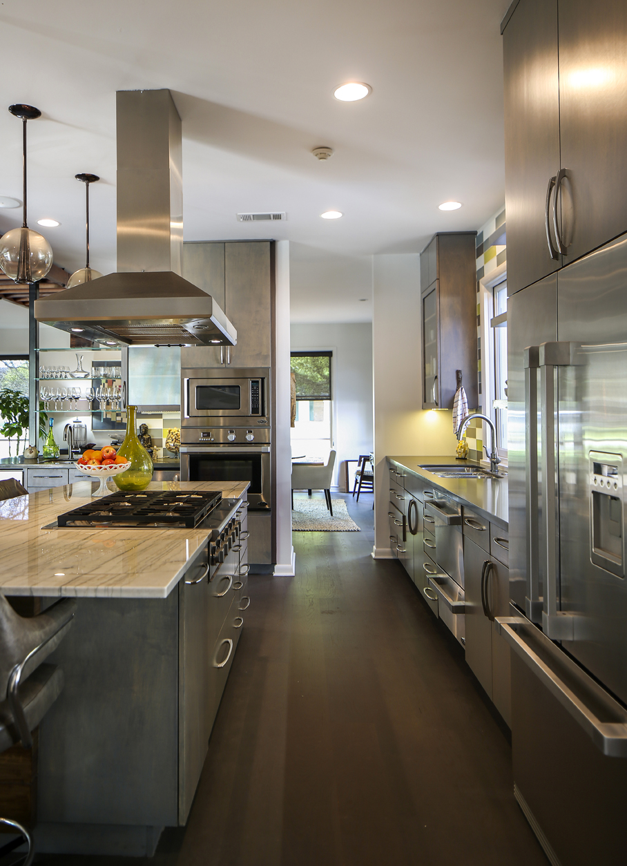 However, the demolition was not a complete gut-and-toss job. The Majors appreciated the walnut wood paneling that had covered the walls in the den and the office since the house was built in 1955, and they desperately wanted to incorporate the wood into the new design of their home. Rich and their son Alex painstakingly removed every nail from the wood planks they separated from the walls, and Connelly planed and cut the boards. With a grey stain, the walnut paneling has found new life on the walls of the entryway, on the ceiling of the den and along the base of the island.