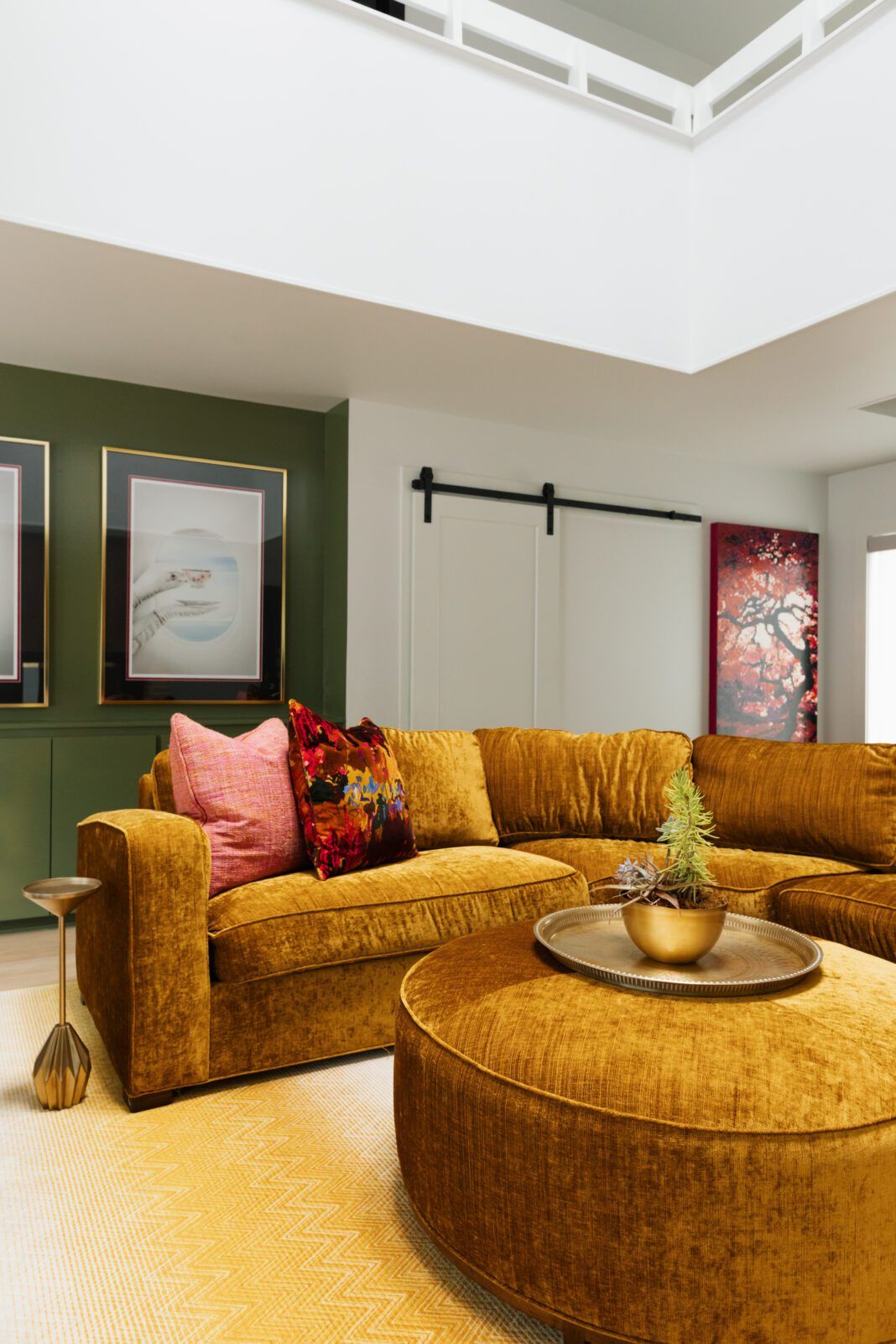 They also mixed new furnishings with vintage pieces, like the French Art Deco sideboard that sits tucked against a brightly wallpapered wall in the dining room. The sectional sofa from the family’s former home made the move with them, but it was reupholstered in a golden color that Cole describes as fitting with the “funky” feel of the whole home. “This house is just kind of moody,” he adds, “so we didn’t want the sofa color to be anything too light.”