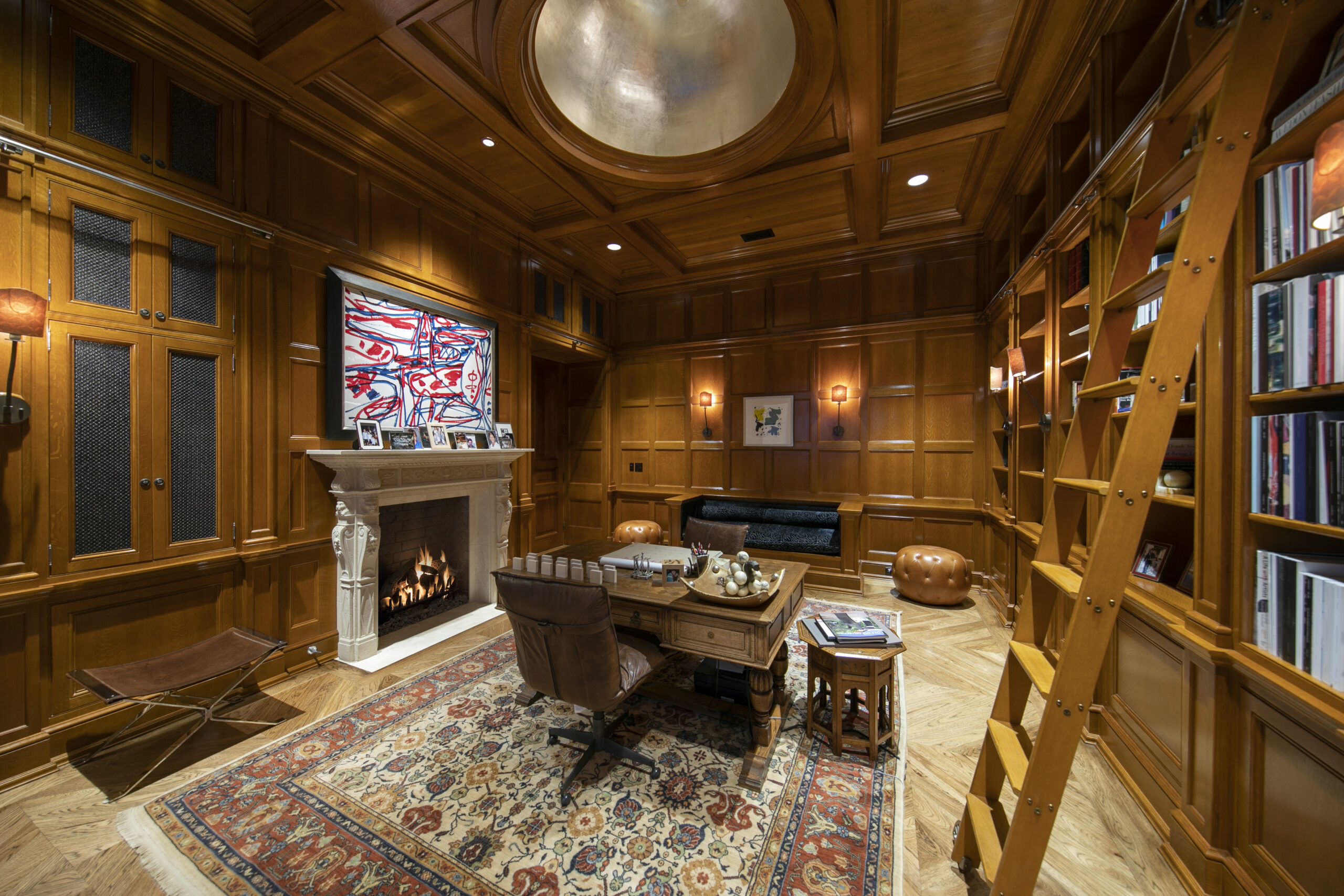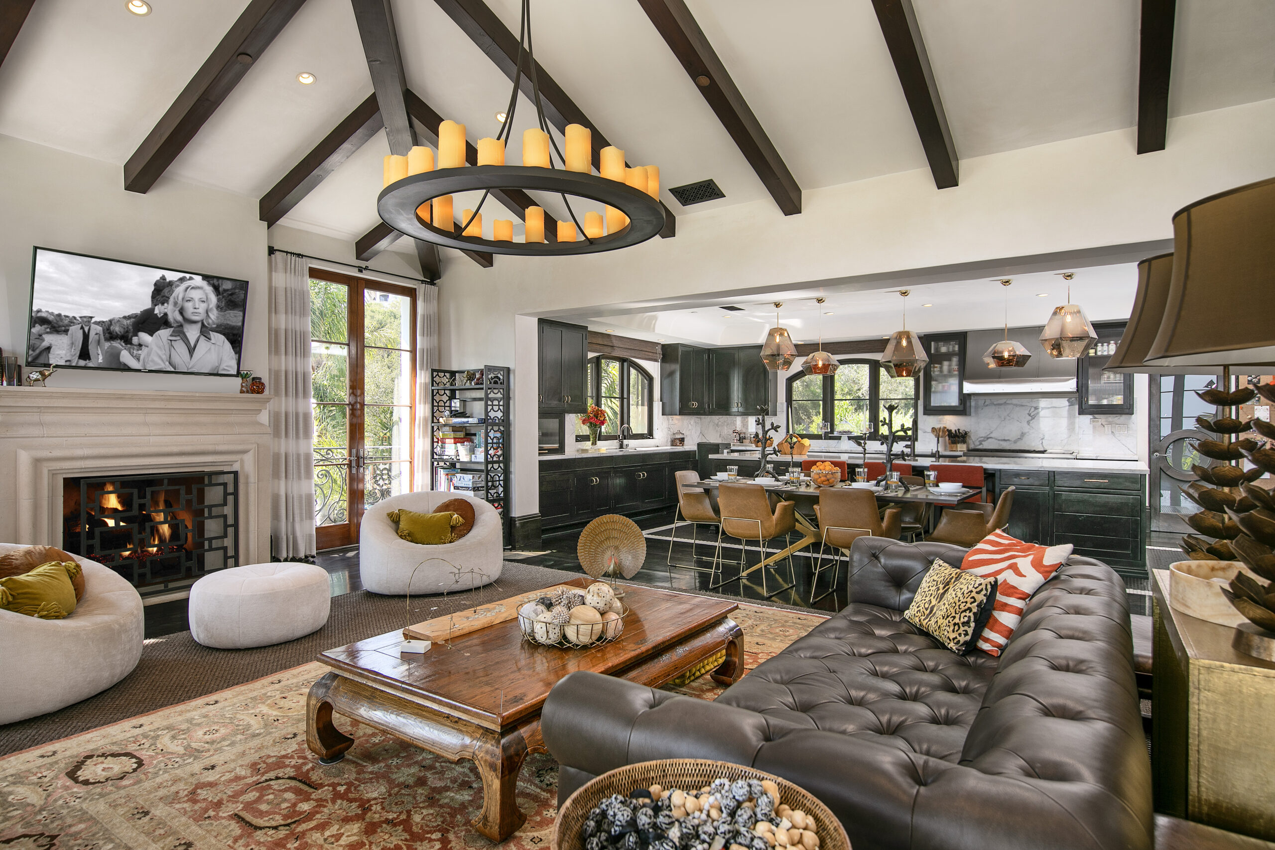 The Mediterranean-style home includes six bedrooms and sits on two acres of land. Inside you’ll see a bar, home gym, game room and multi-functional home theater. Outside of the home, you’ll find a pool, hot tub, vegetable garden, citrus orchards, and even a chicken coop. In keeping with the cinematic theme of the reality show stars, we zoomed in on the home’s theater room in particular, where dark details and comfortable seating make for a cozy experience.