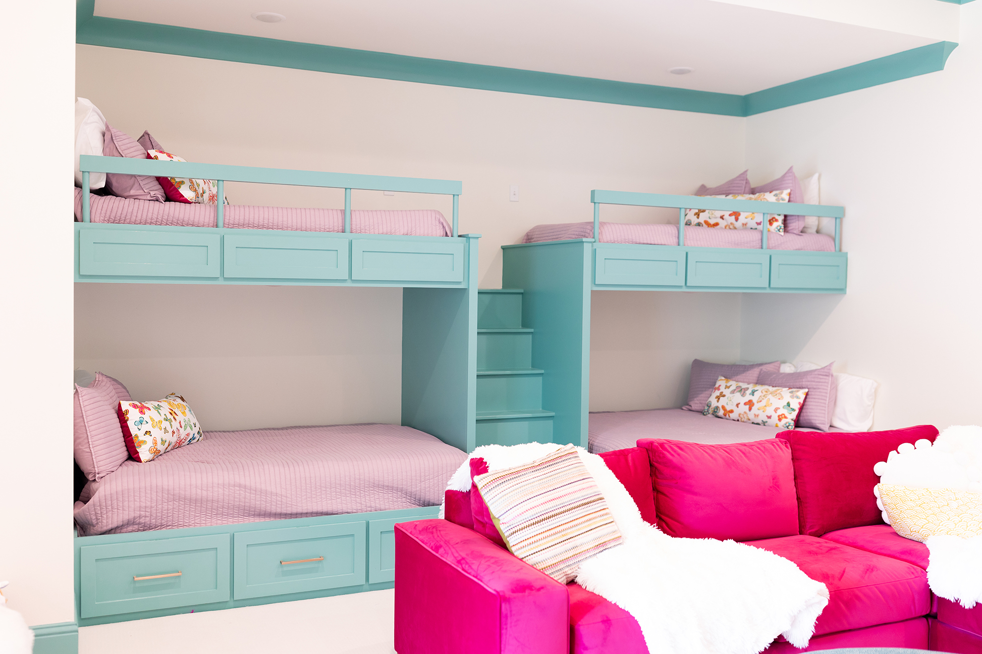 A second-floor playroom has become a hangout space for the family as well as a hub for the girls’ sleepovers with friends, thanks to four built-in bunks. “We like to play video games up there, or we’ll curl up on the big pink couch and watch movies together,” Jennifer says.