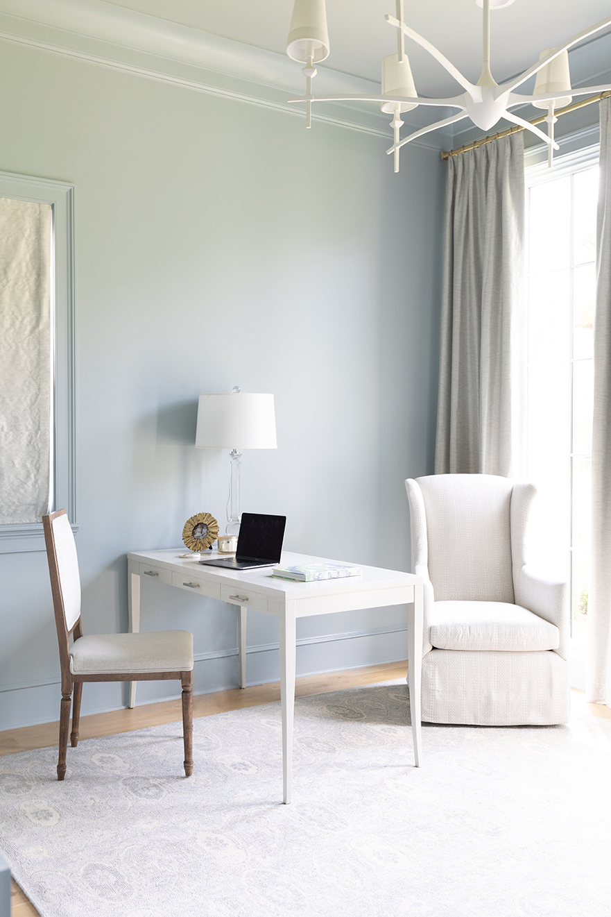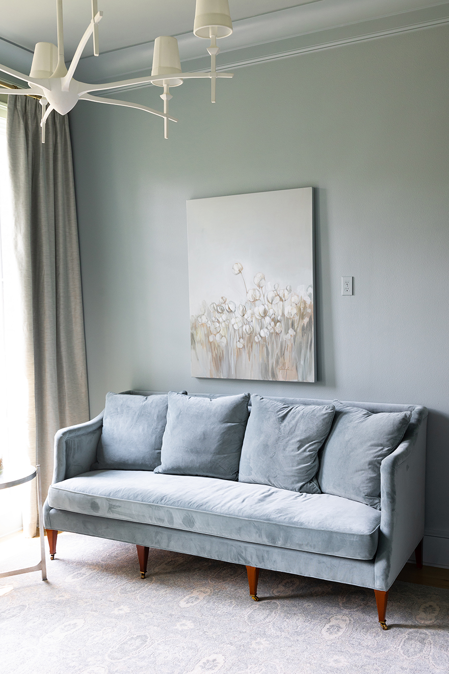 With all that togetherness also came a desire for occasional down time, which is what sparked the idea of establishing a special office-slash-retreat just for Jennifer. The serene blue-painted space was designed to include a streamlined desk, a sleek velvet sofa, and built-in bookshelves to hold some special mementos from her grandmother. “It really turned out to be my favorite room in the house,” Jennifer says.