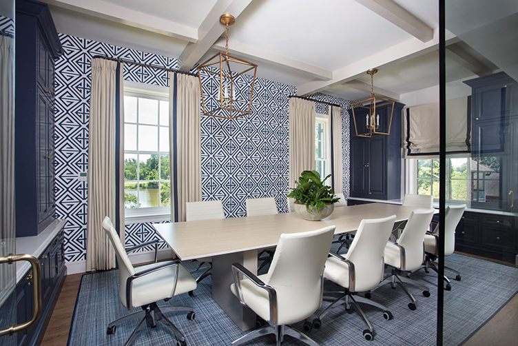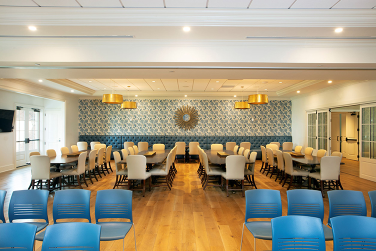 Dated bathrooms and kitchens as well as confined spaces were contemplated when determining whether to redo or rebuild. But the discovery of asbestos throughout the home helped seal the fate of the more-than-50-year-old house. Pennington & Company, a Greek fundraising group from Kansas, and The Kalos Group, a Greek housing development firm from Alabama, were consulted. A fundraising plan was set into motion. Fusch Architects out of Dallas was chosen for the design of the new house, while local contractor Milton J. Womack Construction completed the build. Susan Trousdale Interiors of Florence, Alabama, took on the task of incorporating the Kappa colors of light blue and dark blue throughout the 30,000-square-foot house in way that makes it feel like a home.