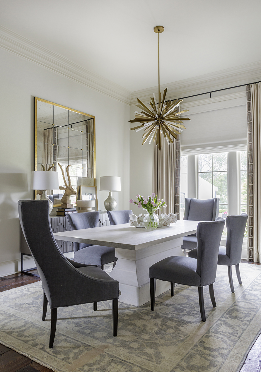 A new breakfast room table was ordered—and rebuilt by the homeowners’ construction company—to perfectly fit the space both in size and aesthetic. Lamps were moved from bedroom to dining room. And custom drapery was commissioned to add extra interest and texture in each room. However, for Cannon and the homeowners, it’s the little details that make the design so successful.