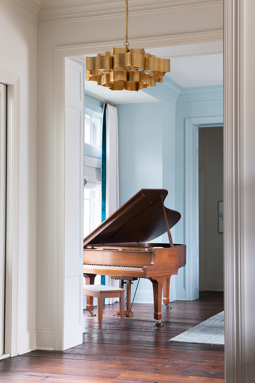 This walk-through space lacked a purpose prior to designer Rachel Cannon making her mark. With the family’s heirloom piano (pictured below) as inspiration, she reimagined the space as a haven for music to be played and shared. Robin’s-egg blue walls and a statement light fixture give a grand feeling, while a textured rug and velvet sofa provide comfort. Photo by Jessie Preza.