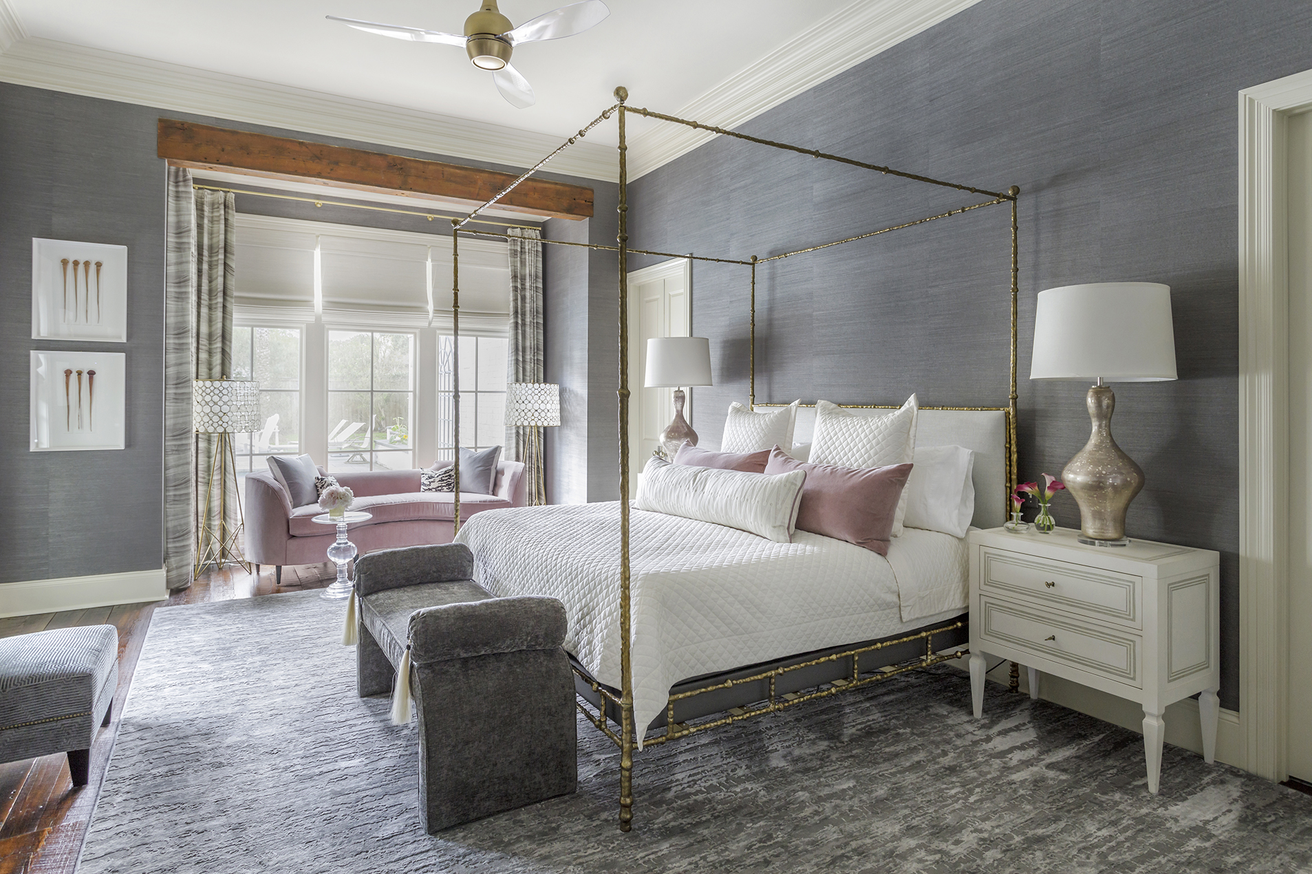 “In the master, we really wanted to create something cozy,” Cannon says. “The feeling that the grasscloth brings is not something that could be achieved with paint in the same color. The texture elevates the entire room.”