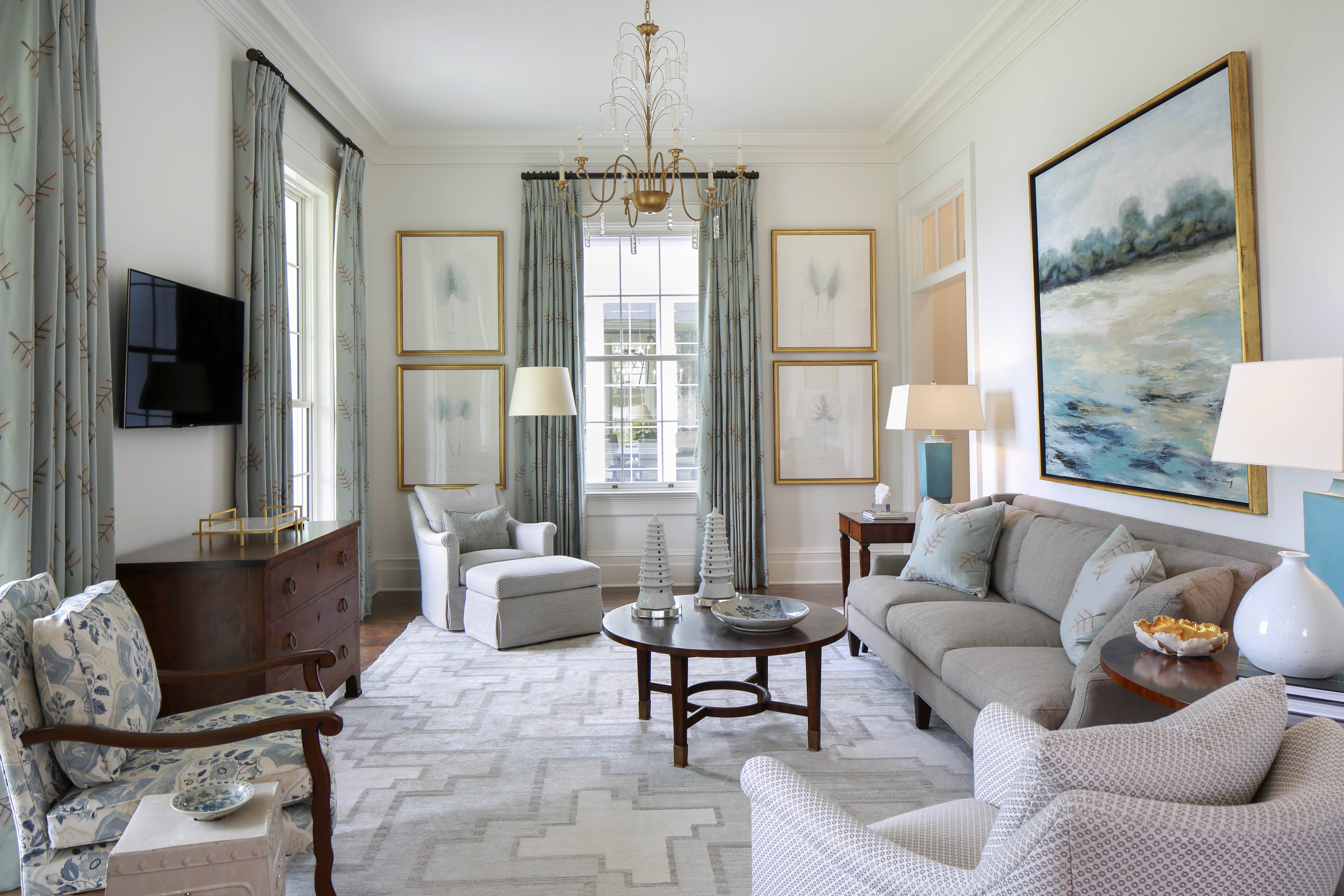 The couple’s priority list of features for their new home included unobstructed views, a big room where family members could congregate, and a second, smaller living space for quieter moments. Cockfield helped ensure that the home’s scale and proportions would perfectly suit its classic style; each of the two stories has 12-foot ceilings, for example, instead of the more often seen 9 or 10 feet on the second floor, and the porch and balcony are a generous 12 feet deep. The architect also added traditional Southern details including dentil molding, pilasters and square columns, and ornate iron railings on the exterior, along with a graciously wide center hall and transom windows over interior doorways.