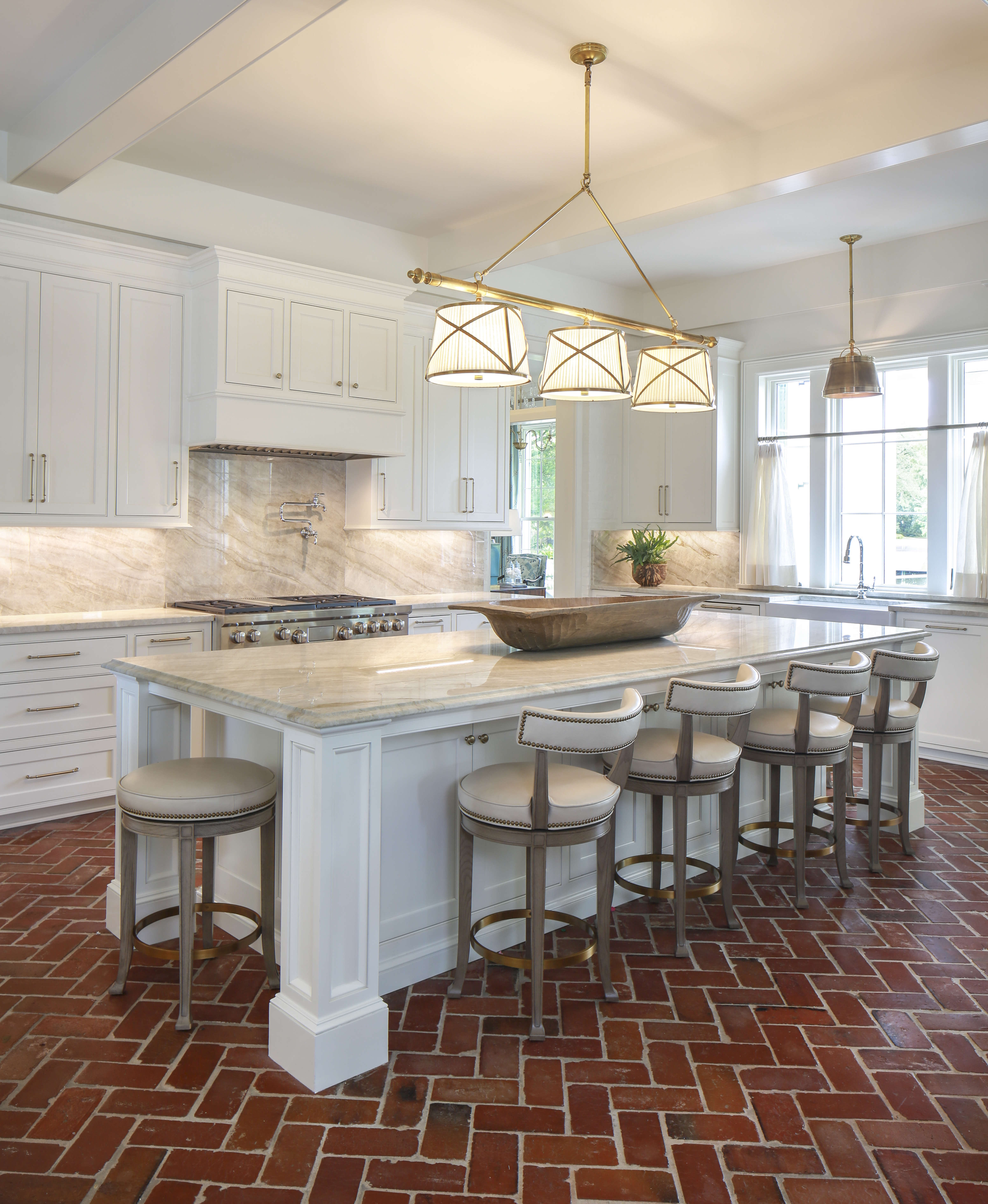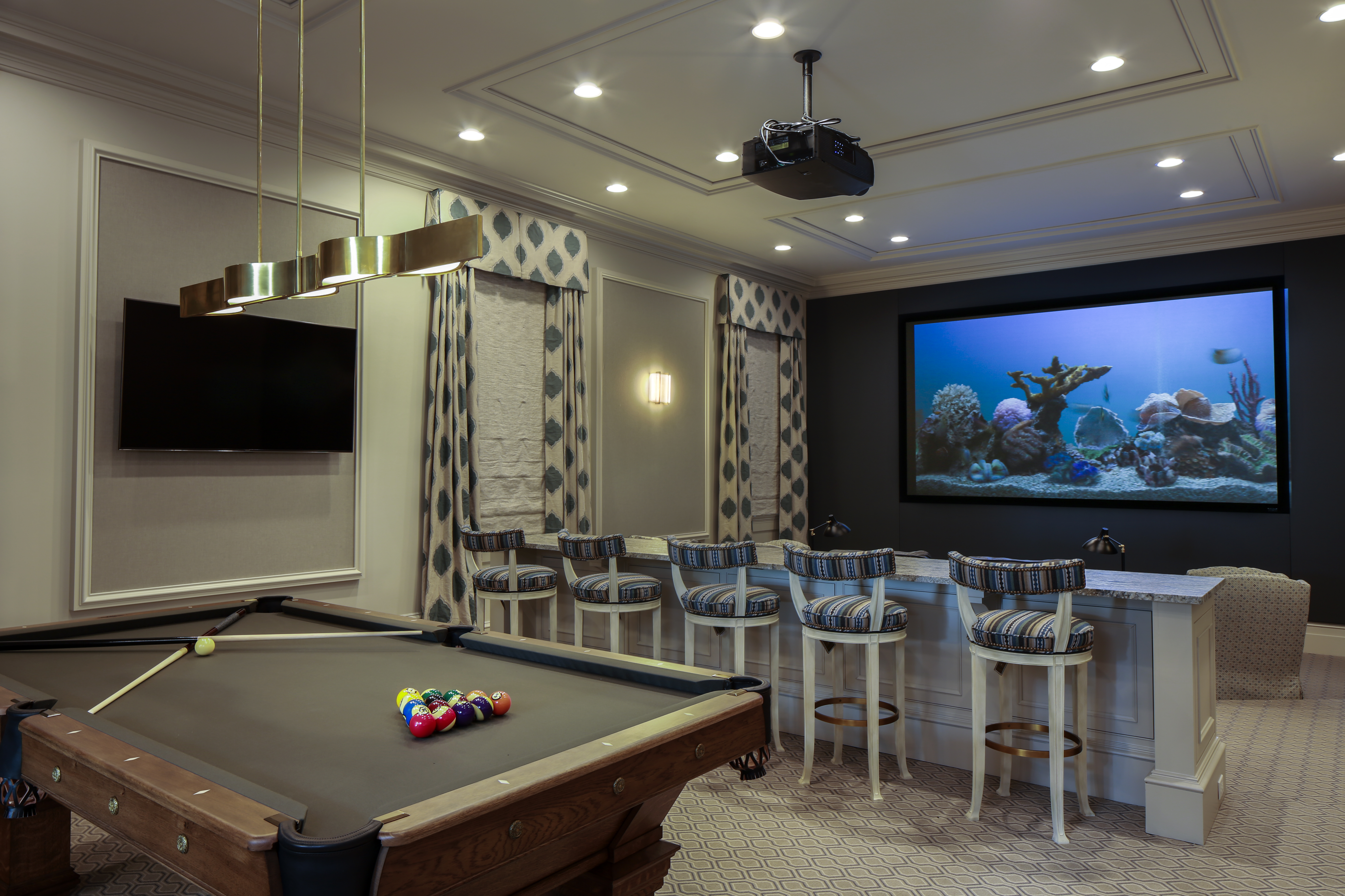 With the home built to accommodate family members of all ages, it was essential to include kid-friendly touches, including stain-resistant upholstery and easy-care brick floors in the family room. Just beyond the center hall, tall French doors lead to another fun feature: the spacious media and game room, which holds both a billiard table and multiple levels of seating set before a 126-inch screen. Even with the doors open, the leather theater seats are hidden from sight until a visitor steps inside. “They wanted it to be a functional space but to still be pretty,” says Landry, who used classic patterned fabrics on curtains and upholstery that minimize the media-room vibe. “Their family is really so important to them, and it just makes me happy that they can enjoy this space and the rest of the house together.”