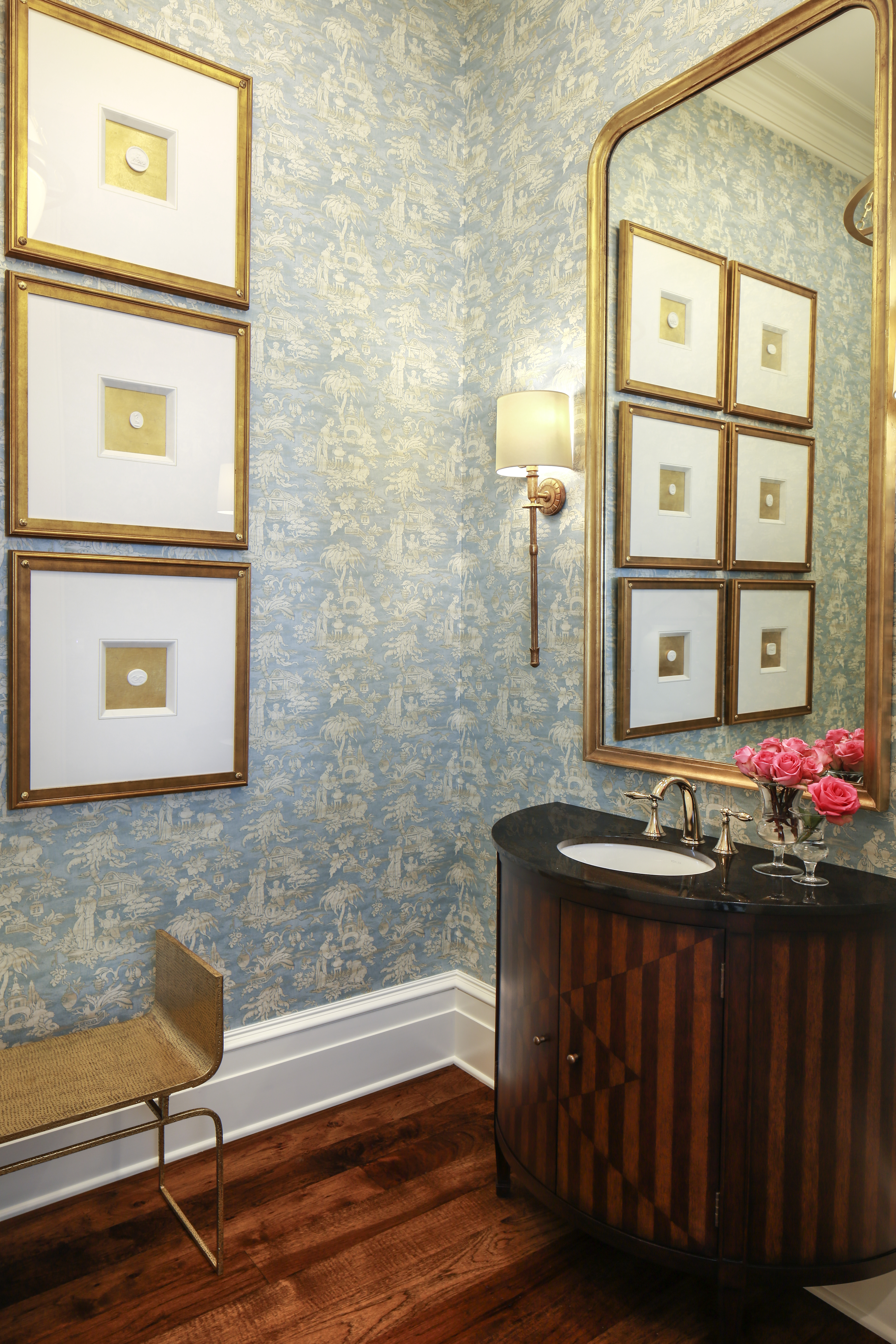 Landry also paid great attention to making a statement in each room through lighting. The wide entry hall is home to two antiqued mirrored-glass chandeliers in a subtly Art Deco style, while an updated two-tier crystal-beaded chandelier hangs in the dining room, and the kitchen island is illuminated by a shaded three-light pendant in antiqued brass. “We didn’t want to give them lighting that would be expected,” Landry says.