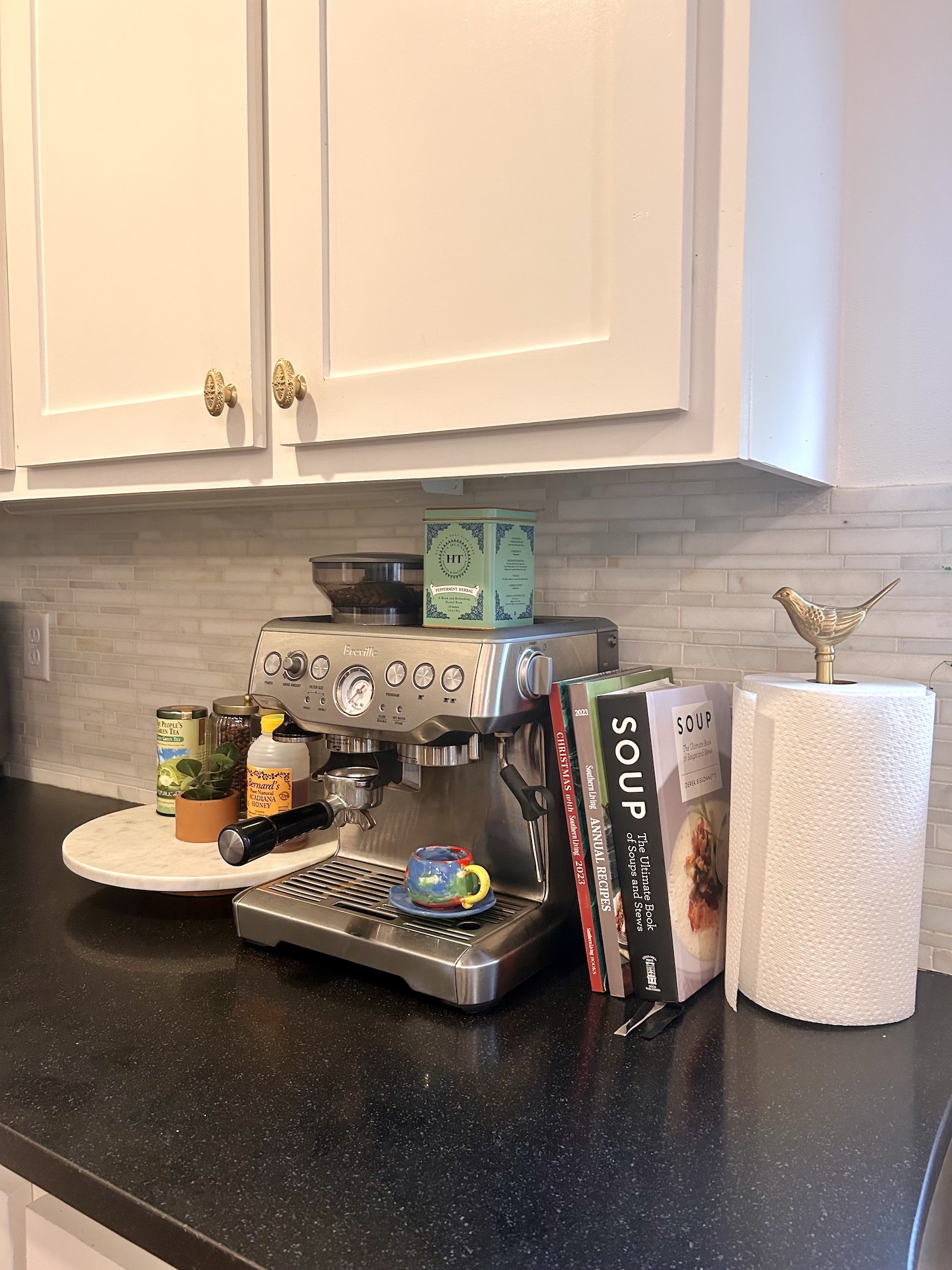 To Marchand, homemade art is one of the best ways to enhance a home’s comfort. Marchand’s two daughters, Penelope and Frankie, created all of the framed art displayed throughout the home, including the mug and artwork pictured above.”I find it invaluable compared to anything else,” she says.