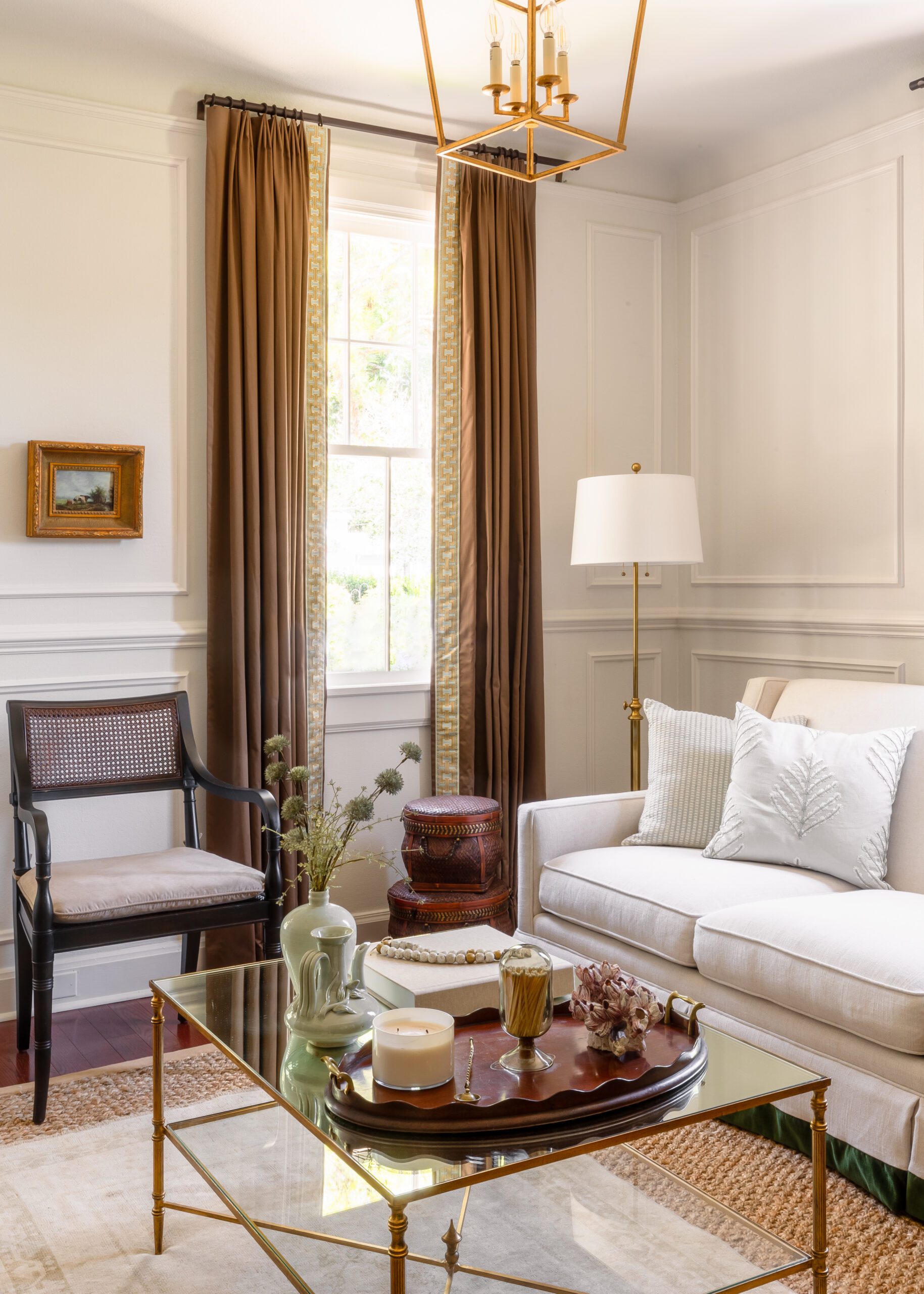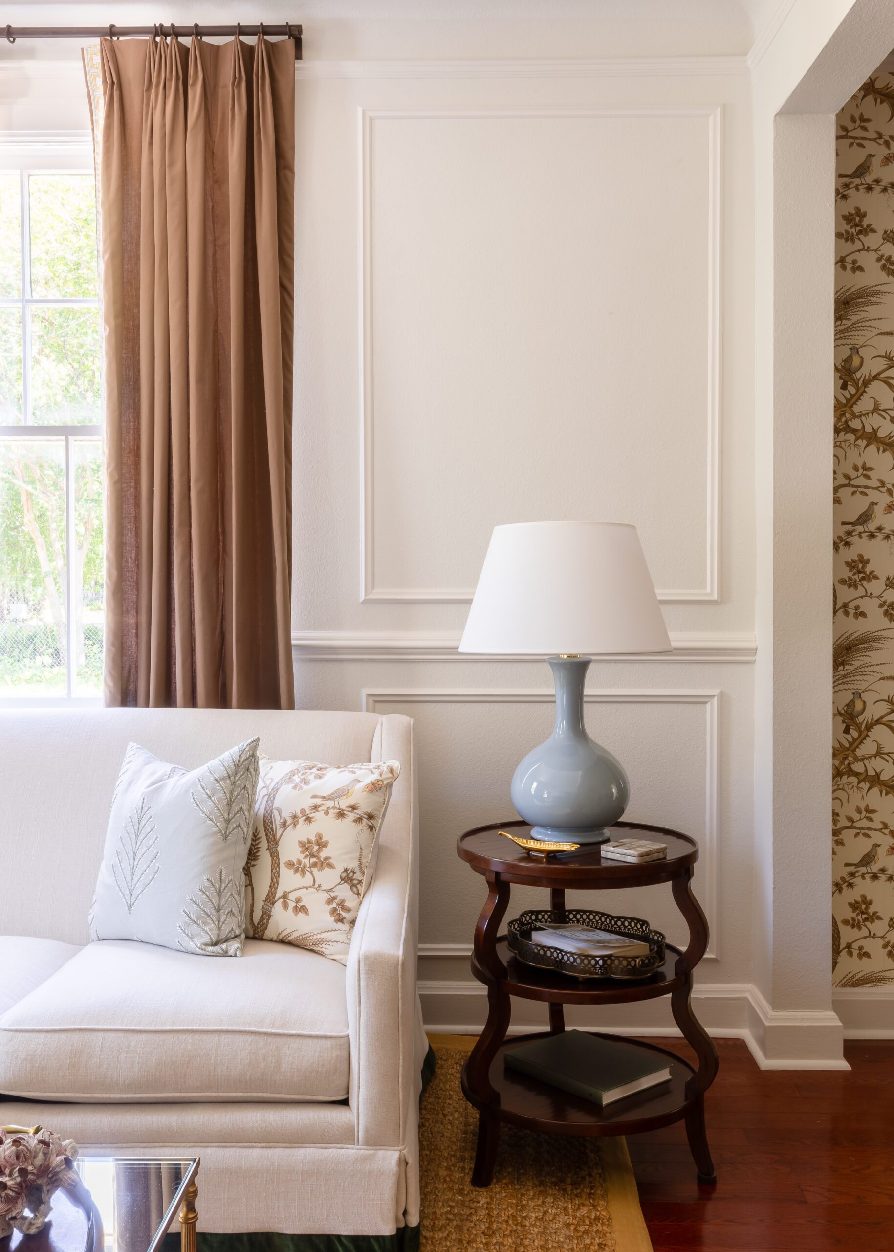The adjacent living room acts as a natural extension of the dining room, with the bold wallpaper pattern carried onto throw pillows and the soft color palette staying consistent. The brown of the wallpaper’s branches and leaves is carried to the living room curtains, which are complete with a delicate ribbon border. Woodworking details on the walls add interest, allowing for the living space to hold its own instead of being overshadowed by the wallpaper in the dining room.