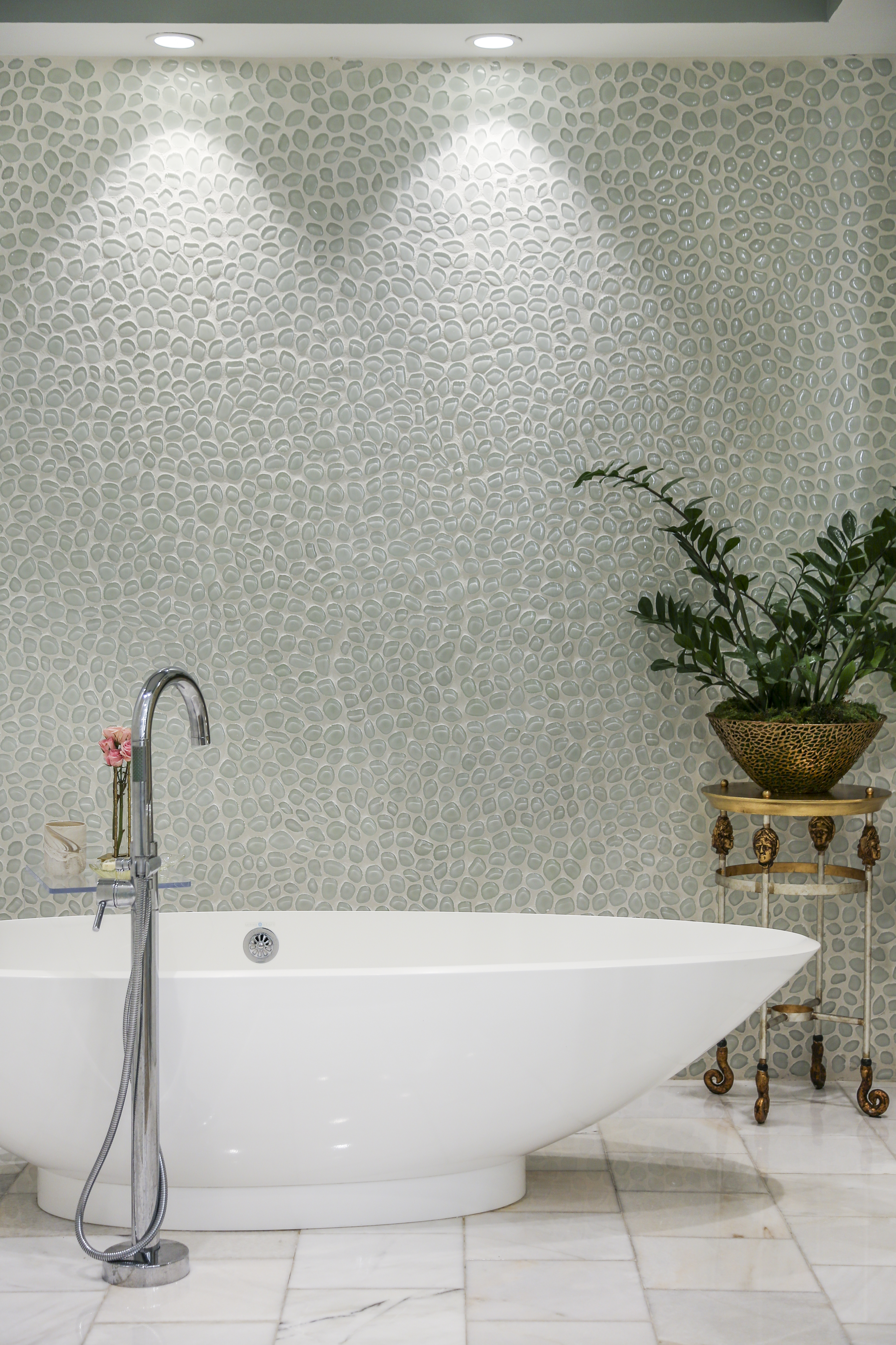 The existing kitchen—with its contemporary glass, metal and exotic wood cabinet panels—took a little more getting used to for Marsha. But a simple replacement of the dark granite backsplash with a new multi-hued linear version helped to brighten up this corner of the main open living and dining space. “Every kitchen we had before this was all white,” she says. “I hated this at first, but I have grown to love it. And James loves, loves, loves to cook in here.”