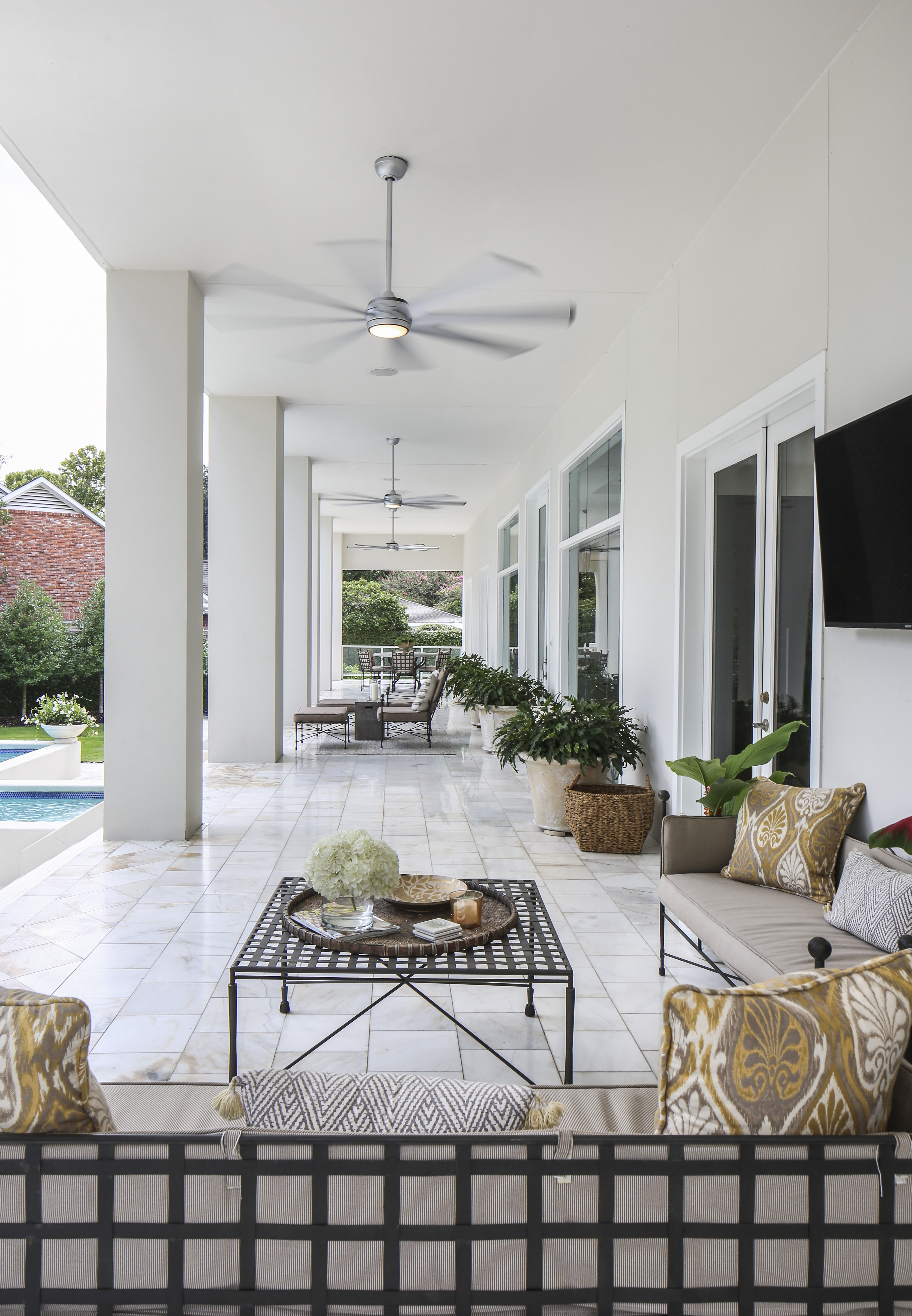 The features that made the Bakers fall in love with this home—streamlined structural details, an open floor plan, ample room for art, and an easy connection between indoors and out—are hallmarks of the tropical modern architectural movement made popular in Miami. In fact, this home was built a dozen years ago based on its original owner’s interest in the south Florida aesthetic. As is common in tropical modern-style homes, tall and wide windows and doors provide views of the landscape and water features from nearly every room, while polished marble covers the floors both inside and out. Warmer than typical modernism, the overall effect is a Zen-like atmosphere filled with natural light and focused on laid-back living.