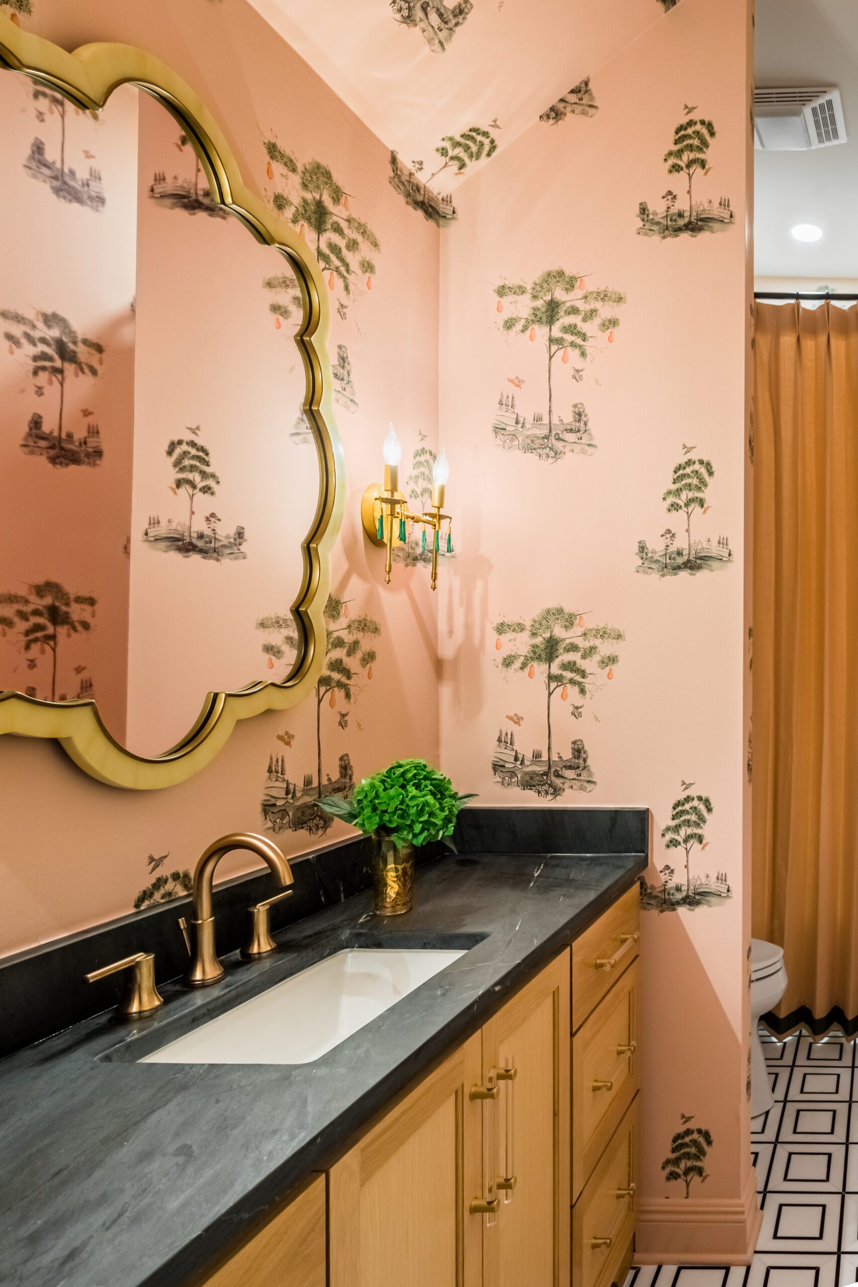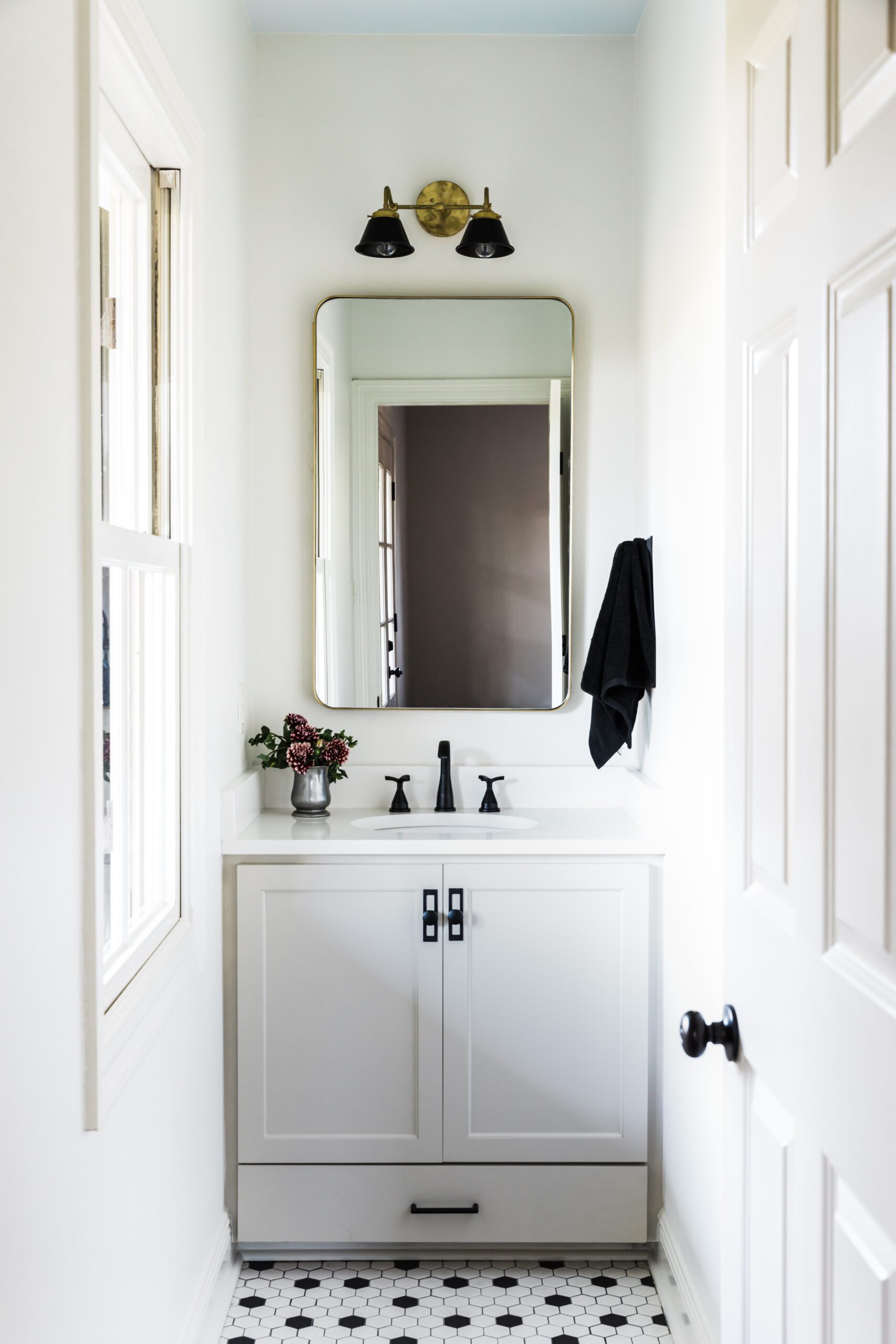 The kitchen—previously home to those annoying dark countertops—was the location of another major makeover. New white oak cabinets extend to the ceiling, a detail that Carmen says was a must-have and provides “tons of extra storage—even if we have to climb up on a ladder to get to it.” The wall above the stove became a focal point with a brass-trimmed hood and tile backsplash in a custom colorway. “And that’s how we ended up with black countertops,” Carmen explains. “We fell in love with that tile, but when you put white stone up against it, it just kind of washed it out. It needed the darker black to complement it.”