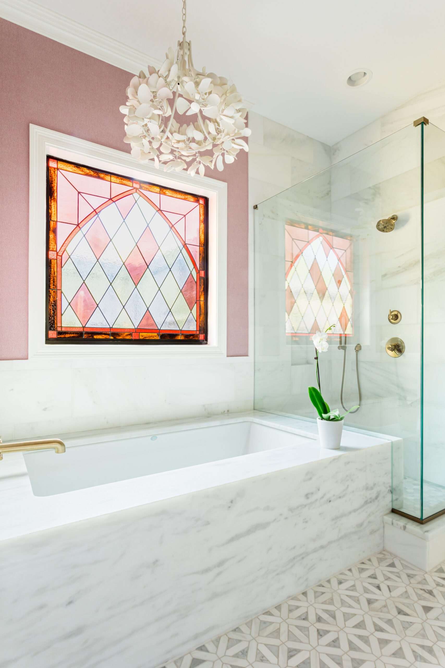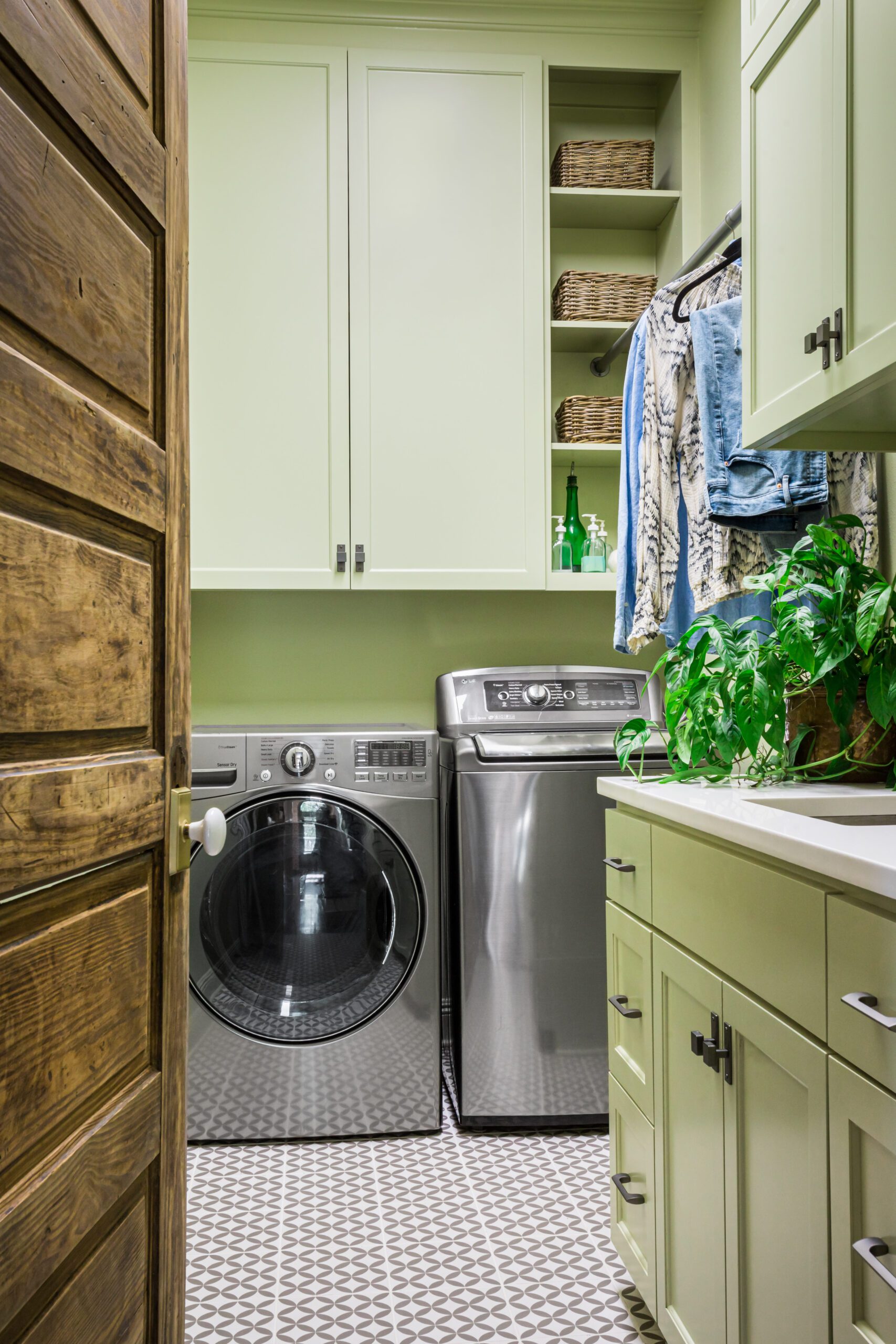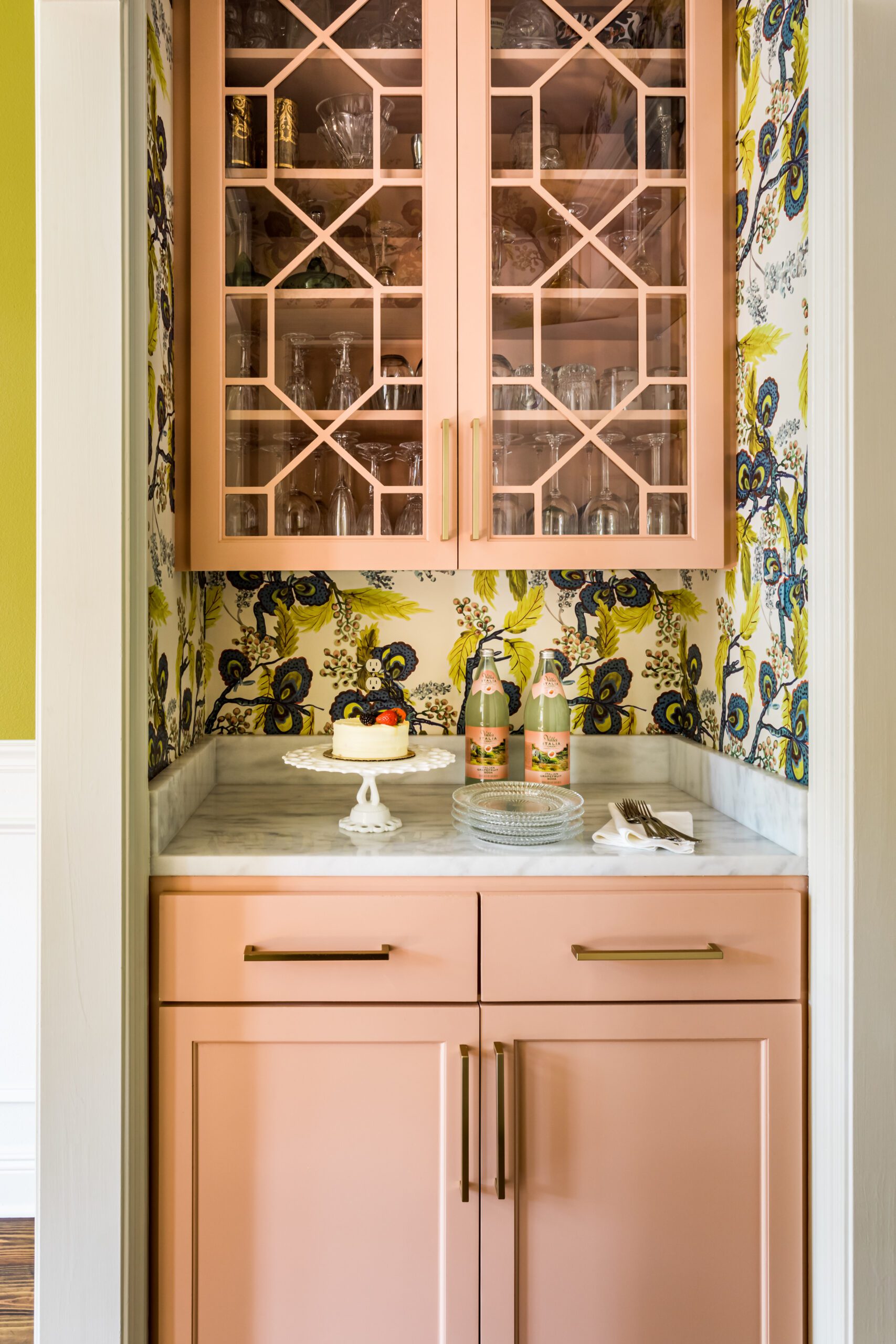 Anne never balked at Carmen’s desire to push the décor past the typical neutral palette into something more lively and energetic. And that energy starts the moment guests walk through the front door into a foyer framed by earthy-pink patterned wallpaper paired with a deep green paint color on the trim. Combined with a chartreuse shade on the dining room walls just off this entryway, it was a mix that even Carmen felt nervous about—for just a moment. “When I saw it all together, I was worried that it was too much,” she admits. “But Anne said it would be fine. And it’s better than fine—it’s great.”