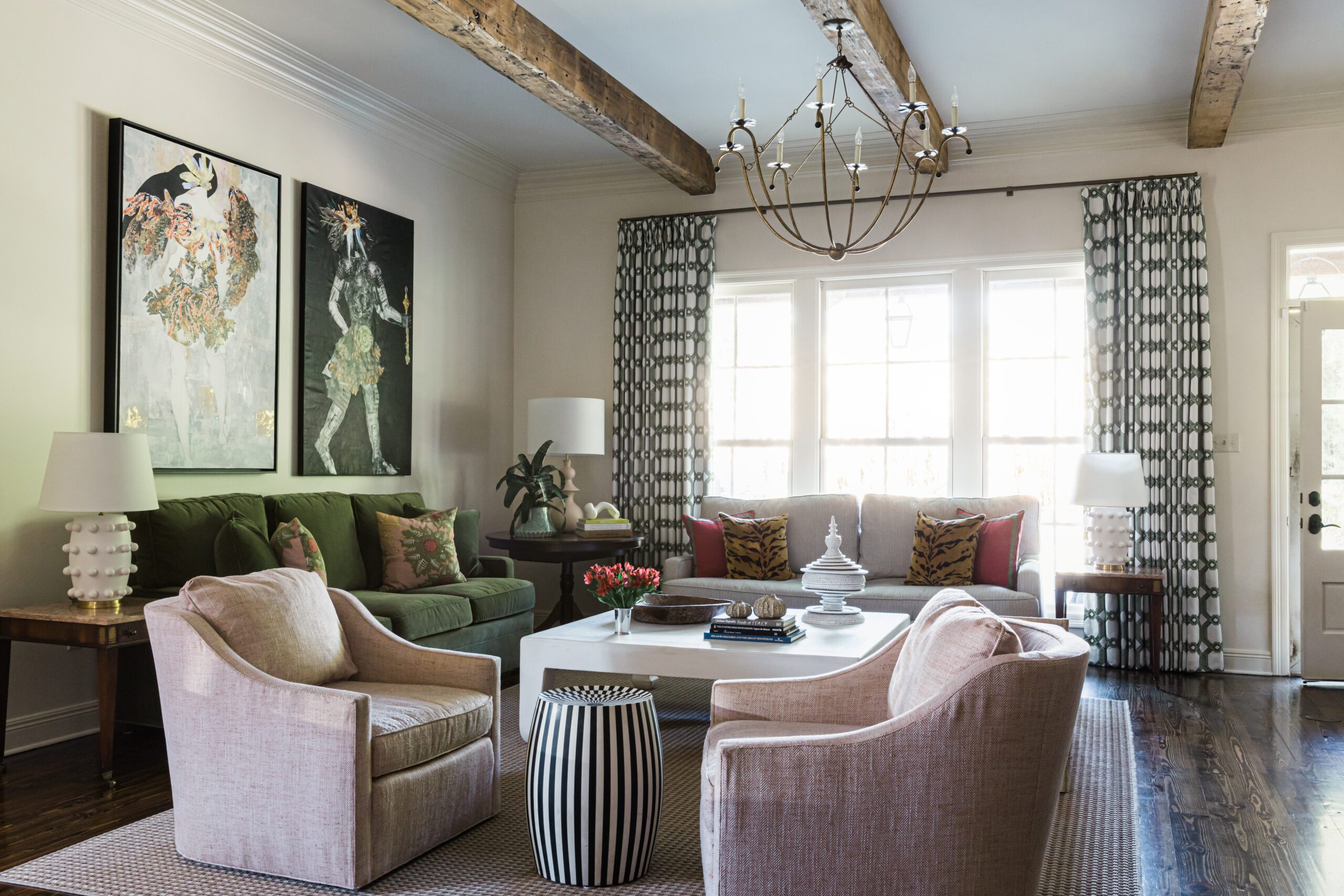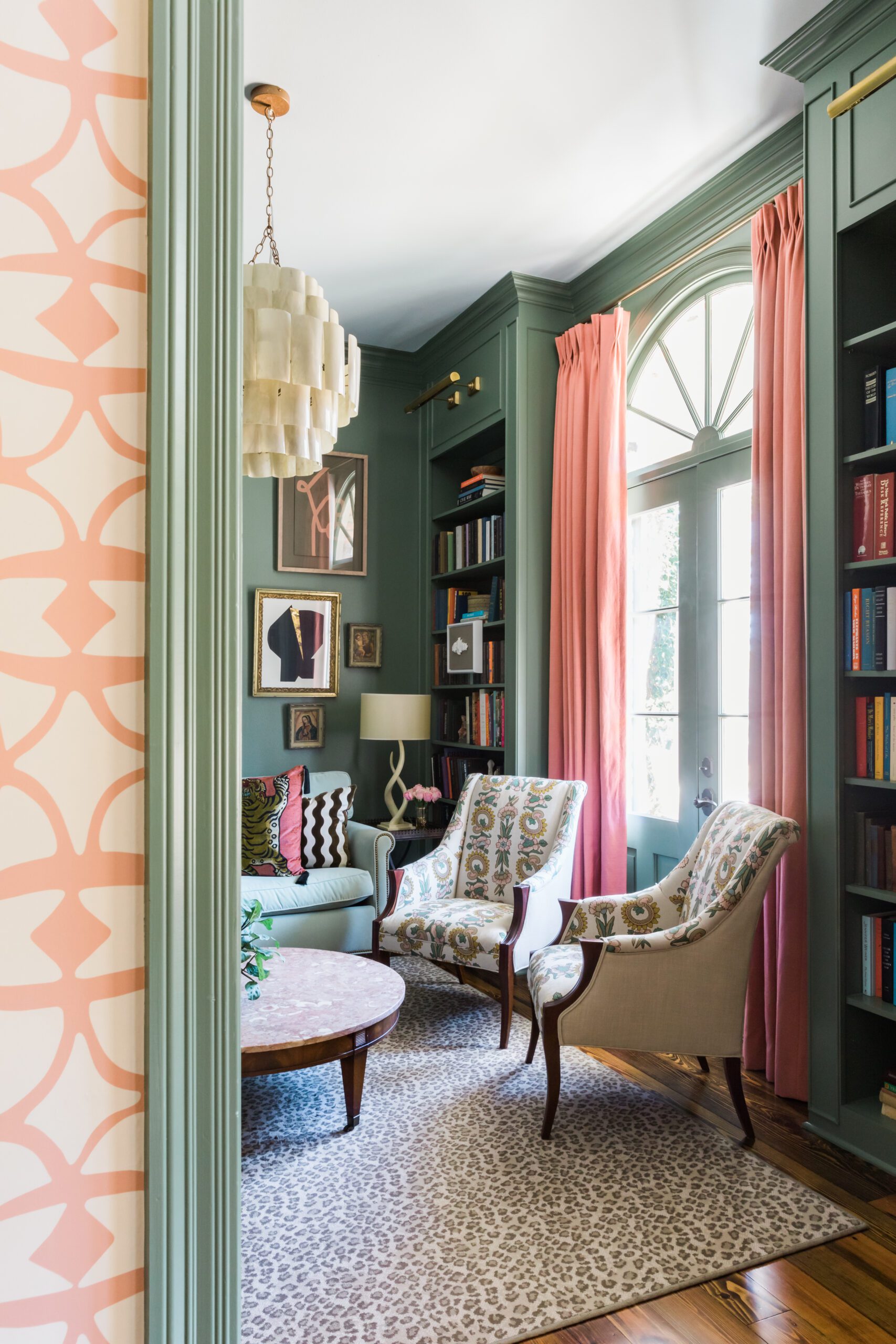 In fact, the green trim serves as a grounding force against the boldly patterned pink paper, and as a prelude to the matching green walls in the study that now takes the place of a former guest bedroom just across the foyer from the dining room. Here, Anne added built-in bookshelves and set the scene with heirloom furnishings including a pair of armchairs recovered in a fresh floral pattern. The pink marble-top coffee table was once in David’s grandmother’s house, along with a pair of end tables that now perch in the living area. Anne created a salon wall above the study’s sofa using some of the family’s favorite artworks along with new pieces by Tracey Mose and Lindsey Porter. “I love the way this room evokes a feeling,” Anne says. “It’s a good mix of old and new.”
