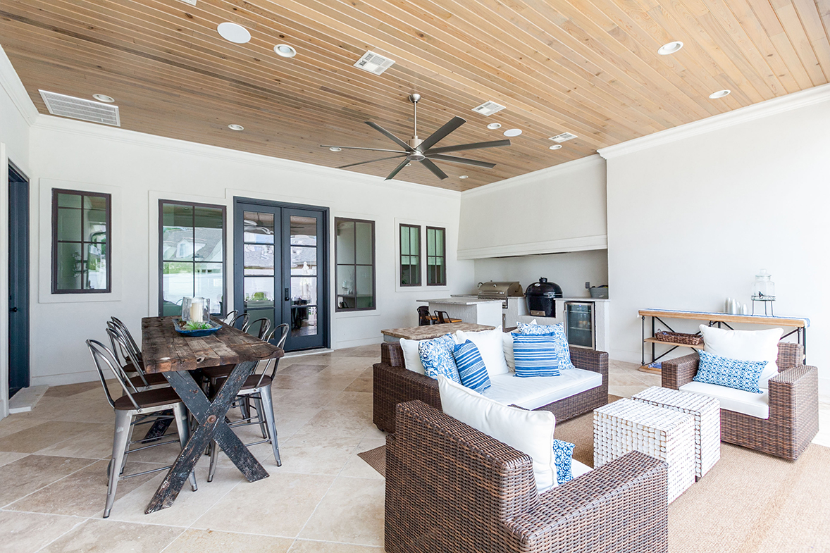 The result was a great room that encompasses the kitchen and dining and living areas. This large space also opens out to the back porch and courtyard. “If we’re inside, we spend 80% of our time in the great room,” Josh says. “But we really spend a ton of time outside, too. I’m barely in my man room because of the back porch—if it’s not freezing or 95 degrees, I’m out there.”