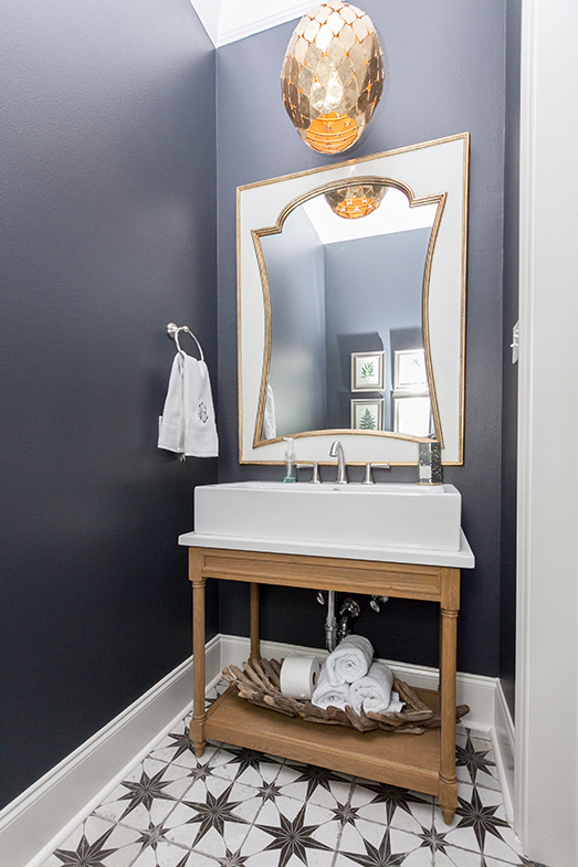 Inside the house, Michael and Brandon continued ticking all the boxes on the Gomezes’ wish list. A 25-foot-high tower was placed just inside the home’s front door, providing the grand entrance that the couple had sought and saved in an inspiration photo. Another image found on Pinterest served as a model for the “reading nook” that Elizeh envisioned beneath the stairs; here, a contrasting blue hue on shelving creates a cozy spot for books and art. The second floor was divided into two separate areas with their own staircases; one has bedrooms and play and lounge spaces for Berlin and Bella, while the other became what Brandon calls “the ultimate man cave.”
