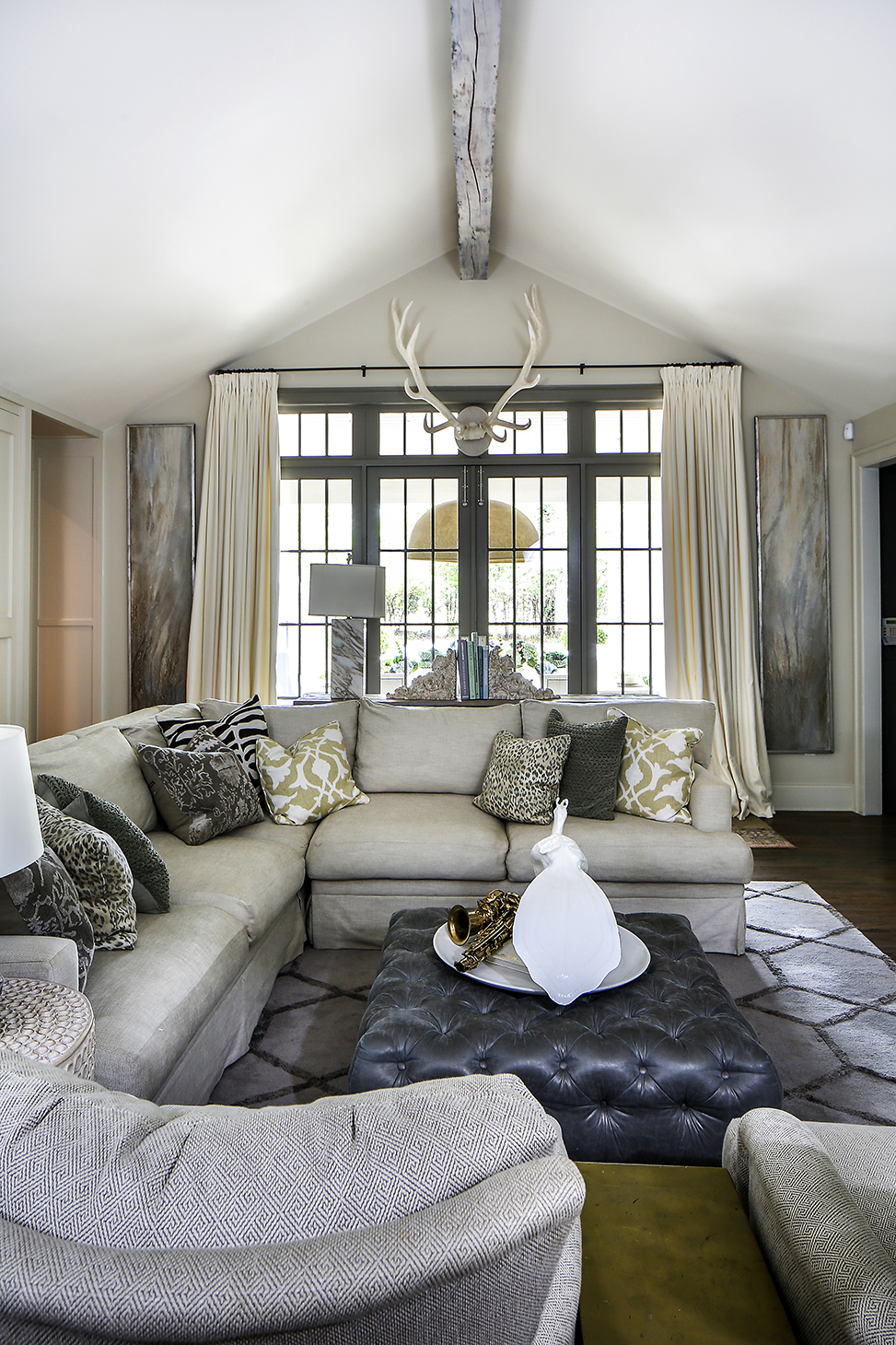 The couple didn’t have to look far to find help in pulling together their new home’s décor. They turned for style guidance to Lauren’s sister Shannon Barksdale Mahon, a designer and partner at their store Mint. “Our goal was to create a light and bright palette with pops of dark color for interest and drama,” Mahon says. “We chose a bright, neutral hue for the wall color that we carried throughout the main entry, formal living room, keeping room, kitchen and family room.”