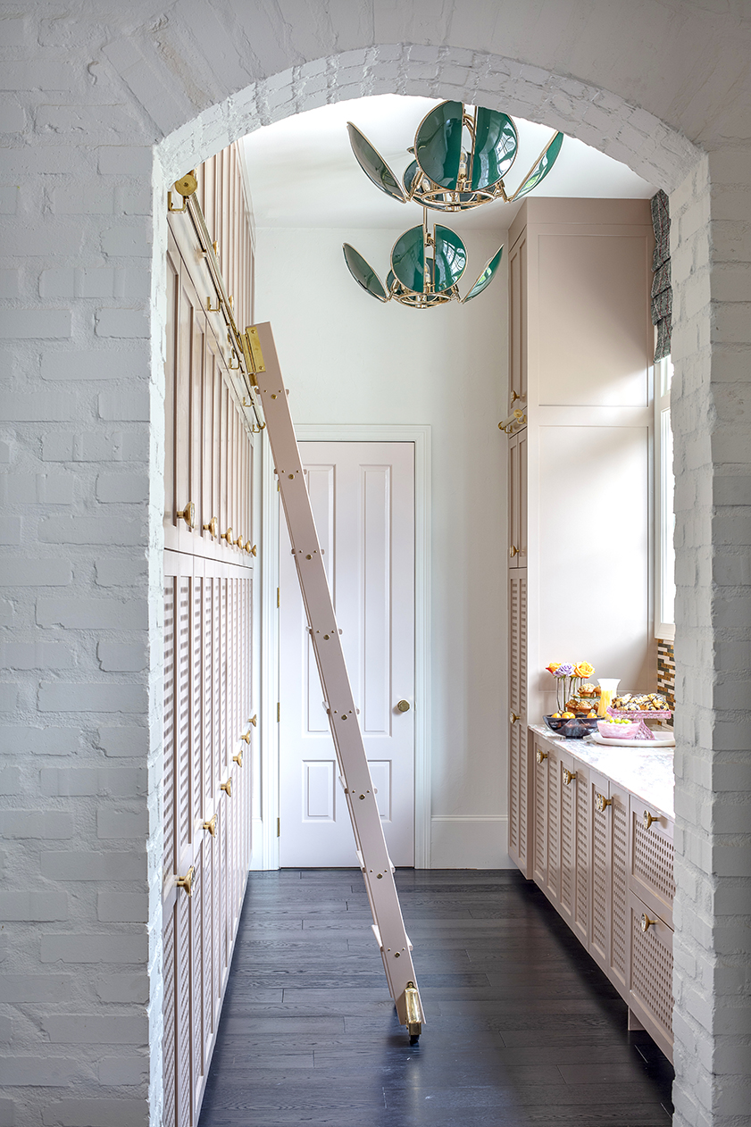 A bolder shade of pink was chosen for the closet because, as Baker says, “why not!” All of the built-ins were custom designs by Baker and KrisBuilt, with a ladder incorporated to move throughout the room.