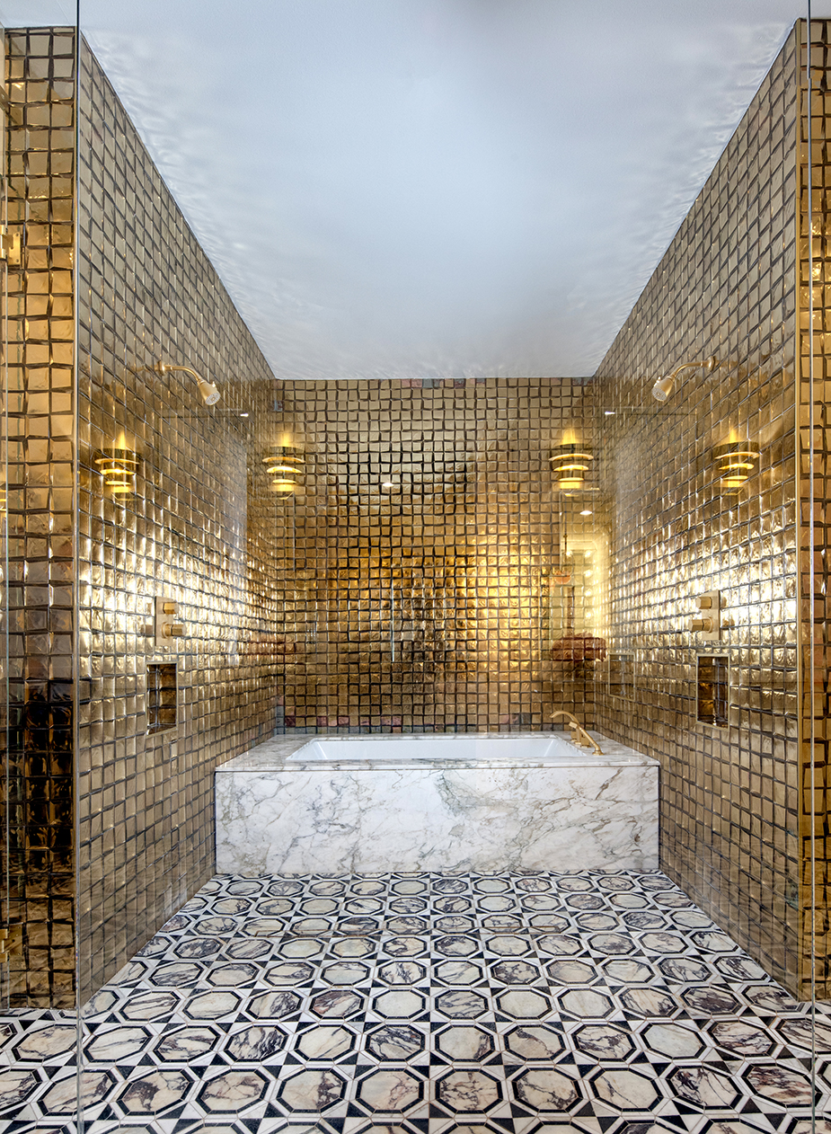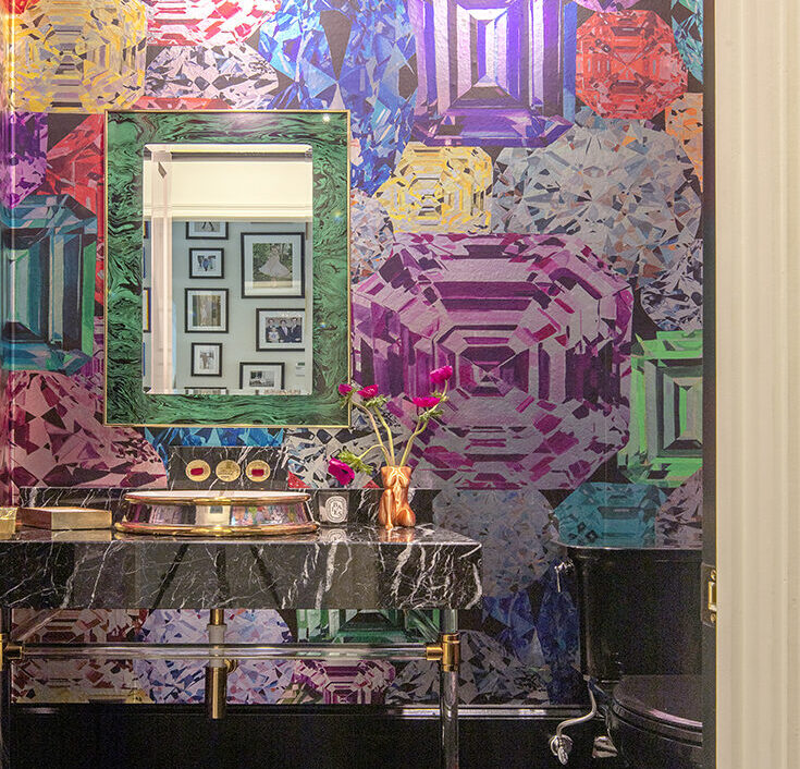 “The biggest challenge for this aesthetic is that it is so glam, but it still has to feel warm. You don’t want to feel like you’re walking into a hotel instead of someone’s home,” Baker explains. “You get that necessary warmth through a mixture of textures, a balancing of the shine.”