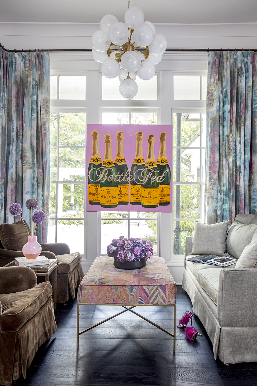 The wide range of colors in this Ashley Longshore painting made it easy to design around, says interior designer Cole Baker. The abstract work on the adjacent wall is by artist Meredith Pardue and was sourced through Ann Connelly Fine Art. The pink Oriental rug was the brainchild of Baker and his rug dealer in Houston; they bleached an existing rug and added pink dye to create a custom look without the long lead time. Photos by Chad Chenier