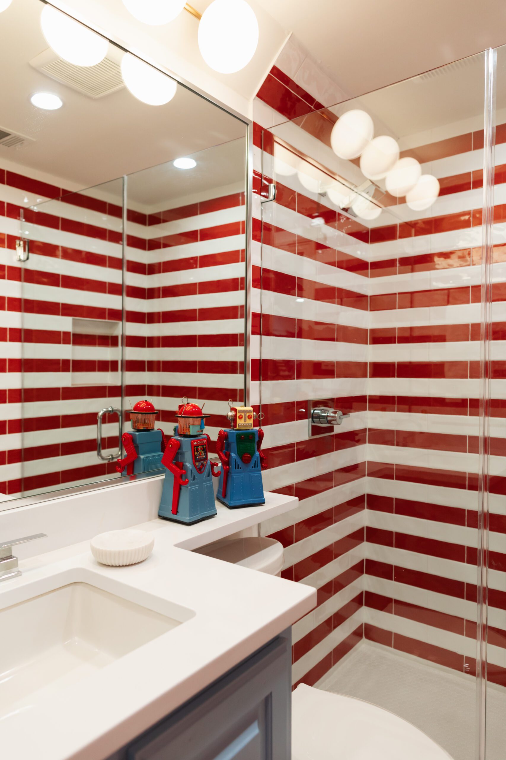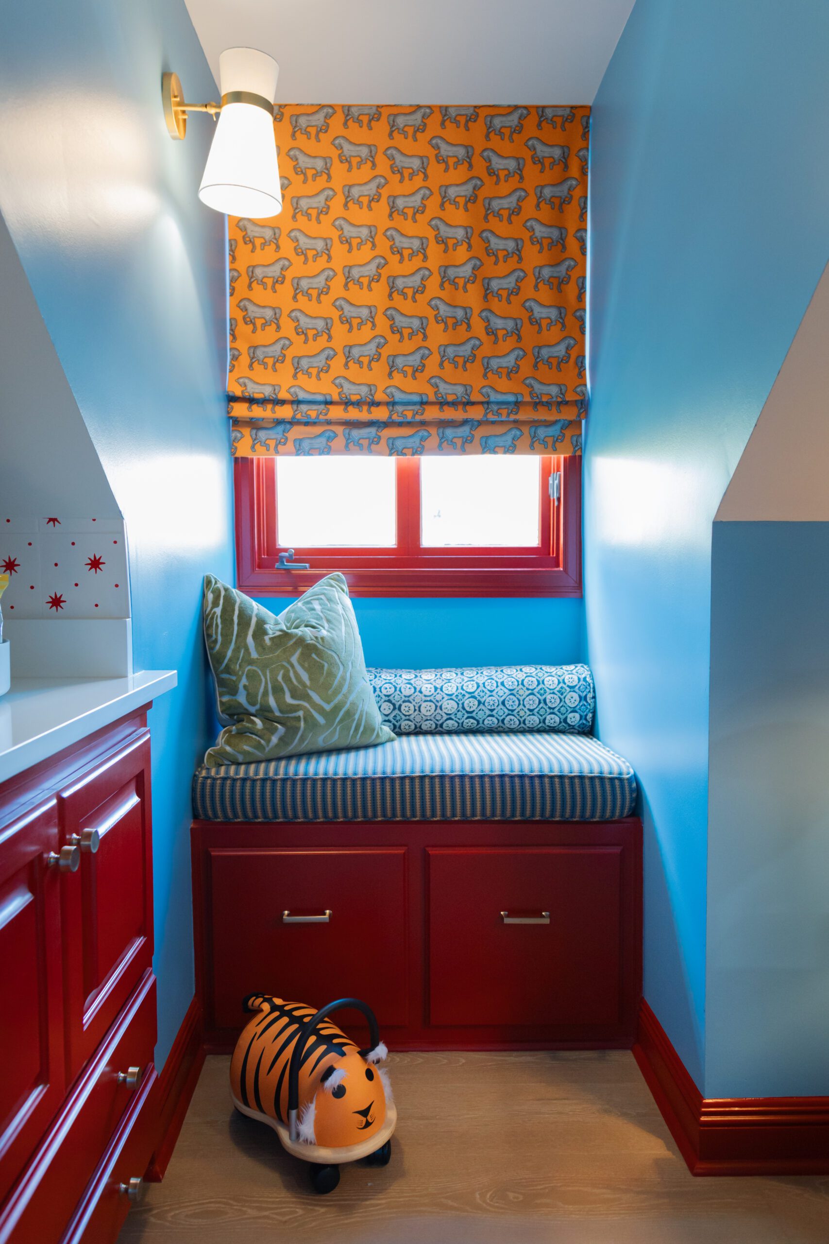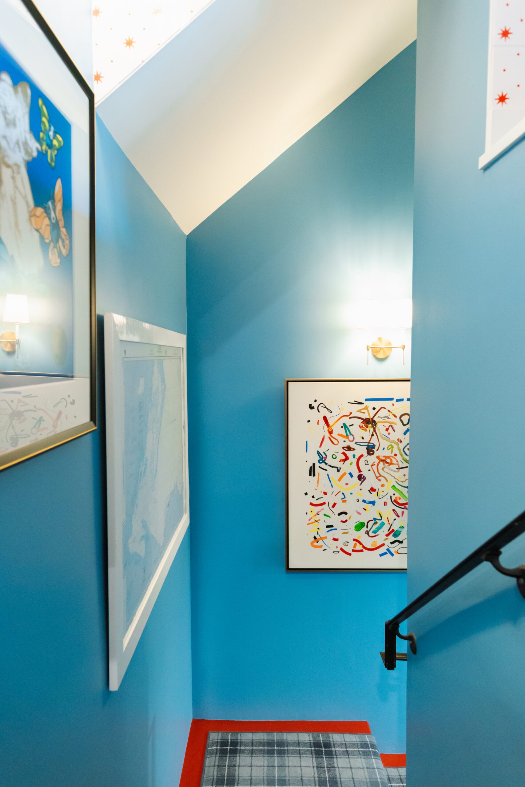 Shades of blue corresponding with the wallpapers cover the remaining walls, while a bright cherry red covers the trim, millwork and stairs. Pops of red are carried to the bathroom, where red and white subway tiles are arranged in a stripe pattern, as well as the small kitchenette with the selection of a backsplash tile featuring dainty red stars.