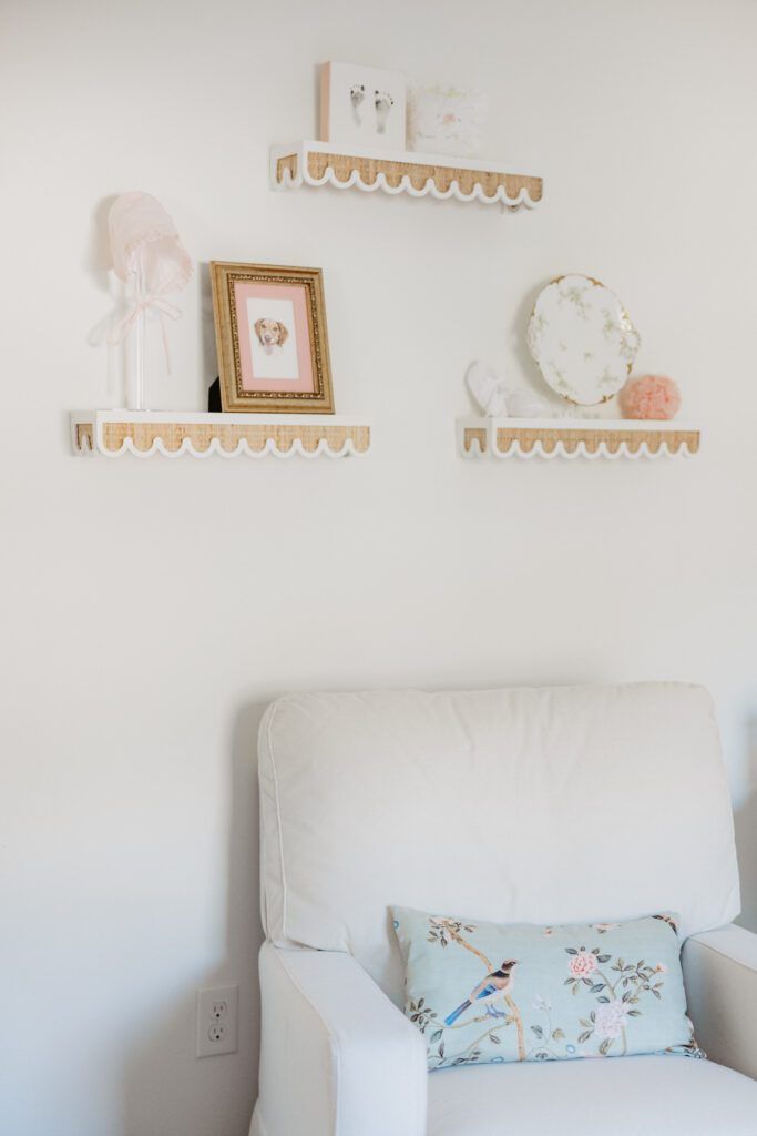 For example, the stacked baskets in the corner of the room add functionality for storage and adorable design, of course. “These stacking wicker baskets with scalloped liners are so helpful for keeping the room organized and free of clutter,” Emily says, adding that displaying a few stuffed animals in the top basket is the perfect way to add a playful element to the space.