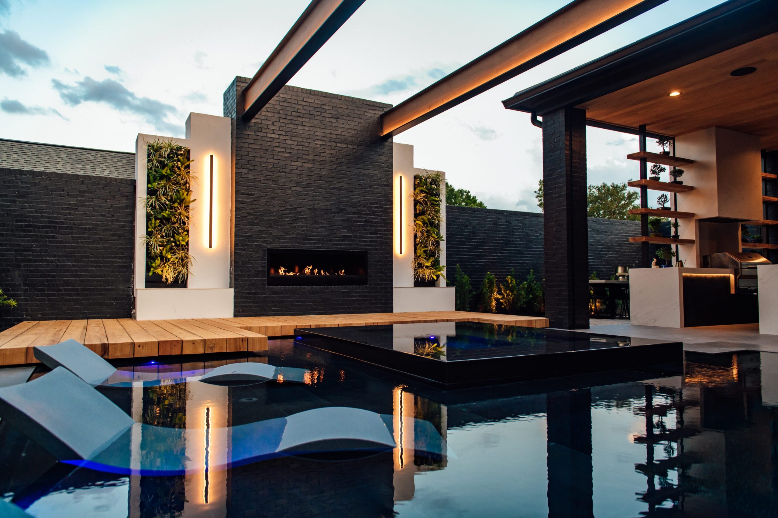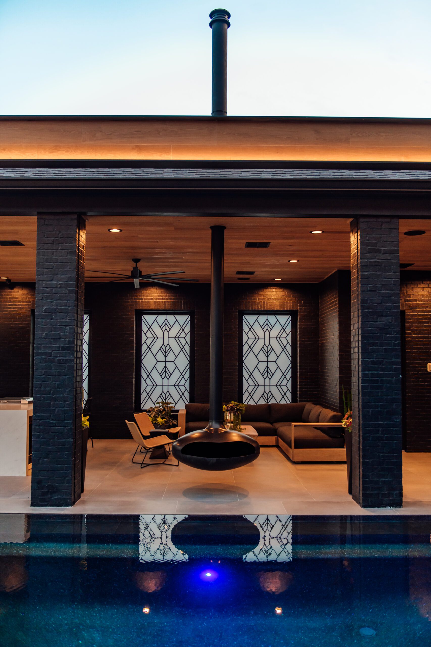 For their Rouzan home, Dantin Builders and Pinnacle Exterior Construction owners Ellen and Shane Dantin chose contemporary materials and dramatic colors in both their indoor and outdoor spaces that transport them far from traditional Baton Rouge design. The couple equipped their home with an outdoor oasis that’s perfect for entertaining, so their friends and family can also “escape” the city.