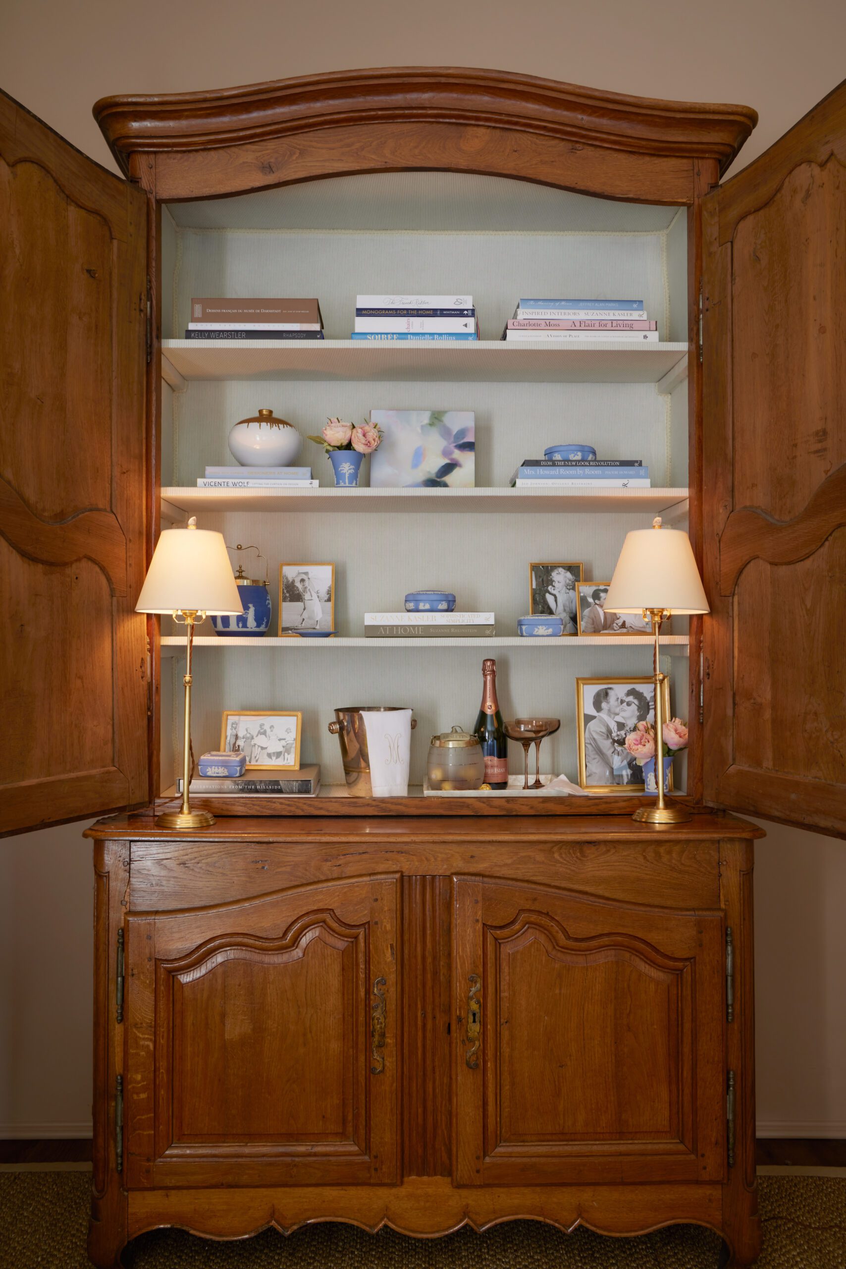 The original design inspiration for this quiet space came from a light fixture that in the end was unable to be delivered on time—only the latest example in a pandemic period filled with supply chain issues. “The silver lining is that we sourced a beautiful antique chandelier from Fireside Antiques that really tied the room together,” Mixson says.